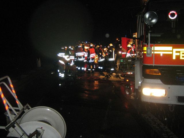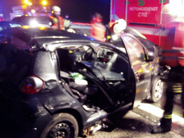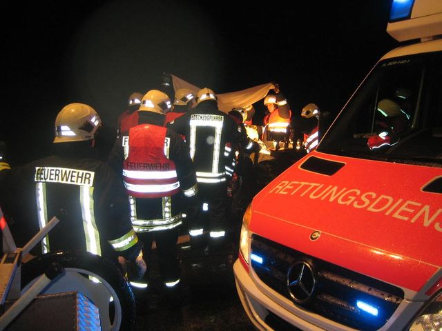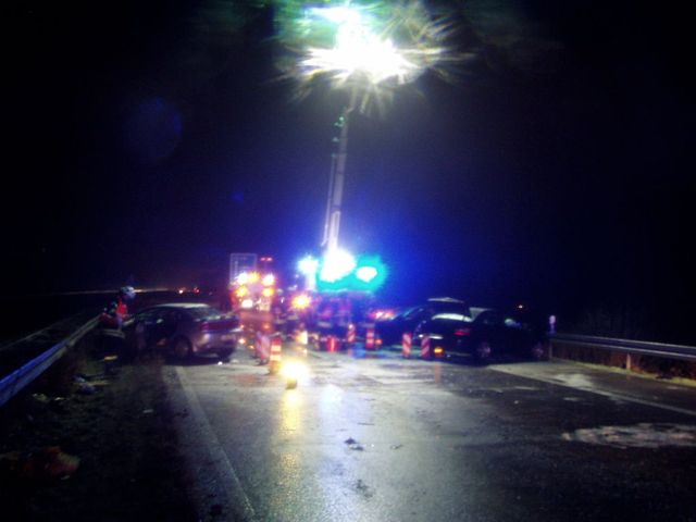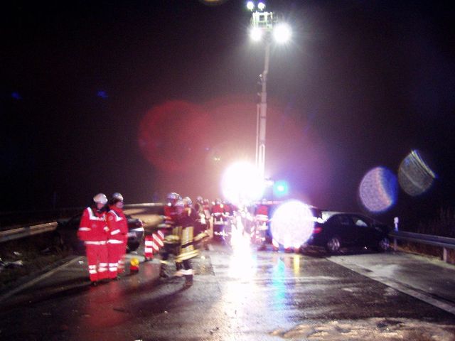 Die Feuerwehr Gescher wurde zu einem Verkehrsunfall auf der A31 in Fahrtrichtung Emden kurz vor der Abfahrt Legden gerufen. Aufgrund von Blitzeis kam ein Fahrzeug ins Schleudern. Ein nachfolgendes Auto konnte nicht mehr rechtzeitig bremsen und prallte in die Fahrerseite des querstehenden Autos. Die beiden Insassen des querstehenden Fahrzeuges wurden schwer verletzt und waren im Fahrzeug eingeklemmt. Der Fahrer des anderen Fahrzeugs wurde ebenfalles verletzt. In die Unfallstelle ist dann noch ein weiteres Fahrzeug gefahren. Auch der Fahrer dieses Fahrzeuges war verletzt. Das Dach sowie die komplette Beifahrerseite des Fahrzeug der beiden eingeklemmten Personen wurde entfernt, so dass die Personen befreit werden konnten. Nach Versorgung aller Verletzten durch den Rettungsdienst leuchtete die Feuerwehr die Einsatzstelle für die Unfallaufnahme aus. Hierbei kam auch der Teleskopmast zum Einsatz. Die Autobahn war während der Rettung und der anschließenden Bergung der Fahrzeuge komplett gesperrt.