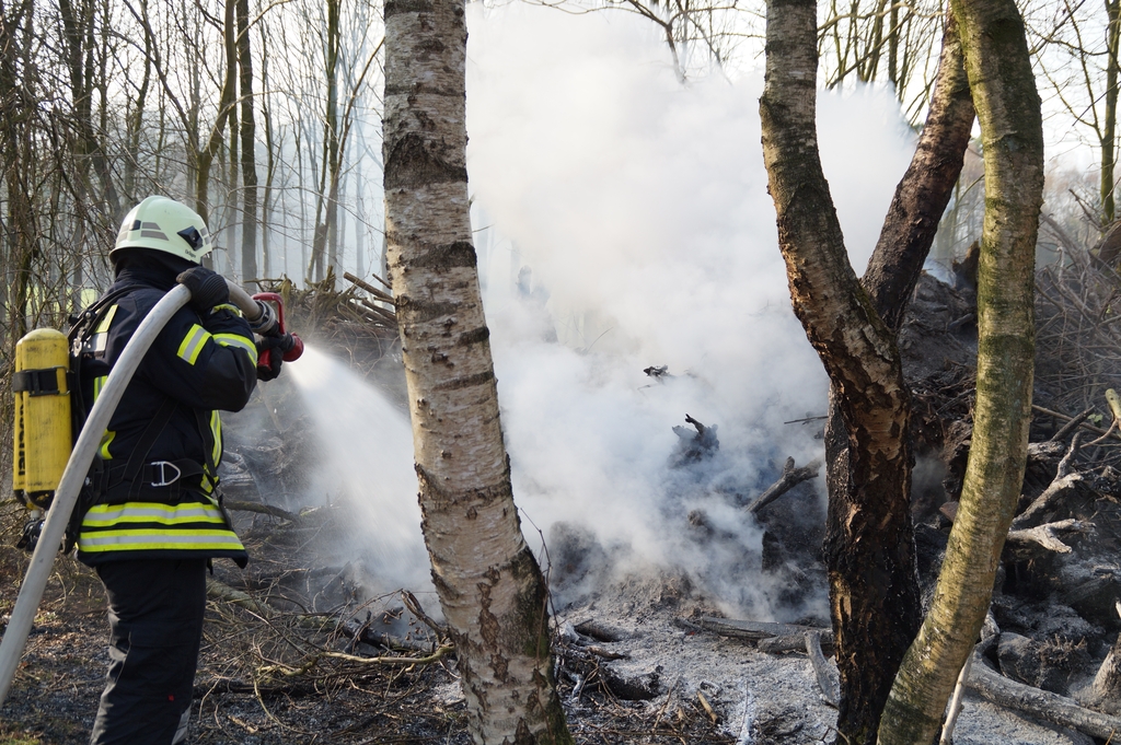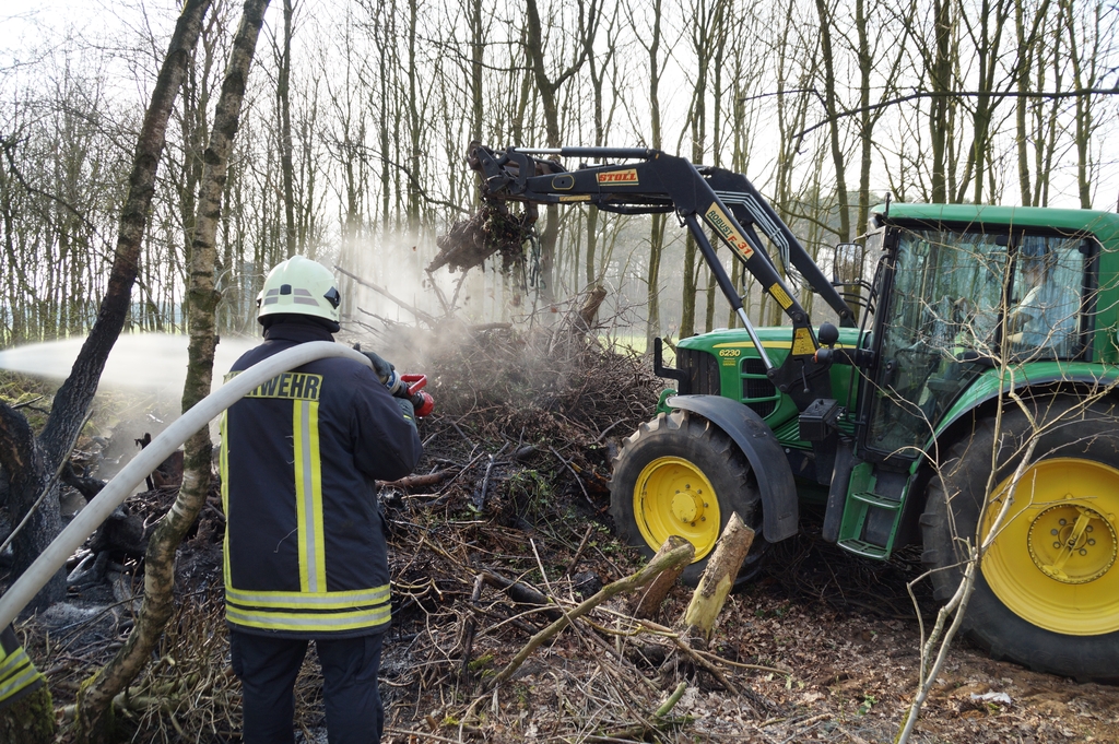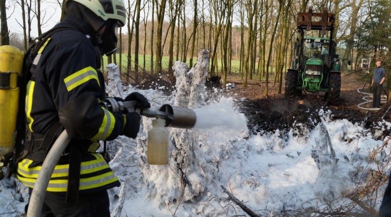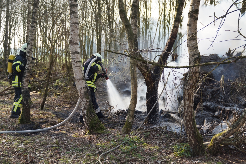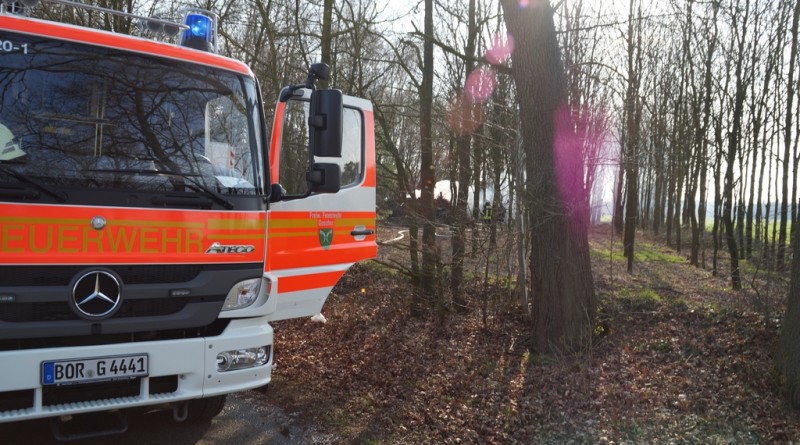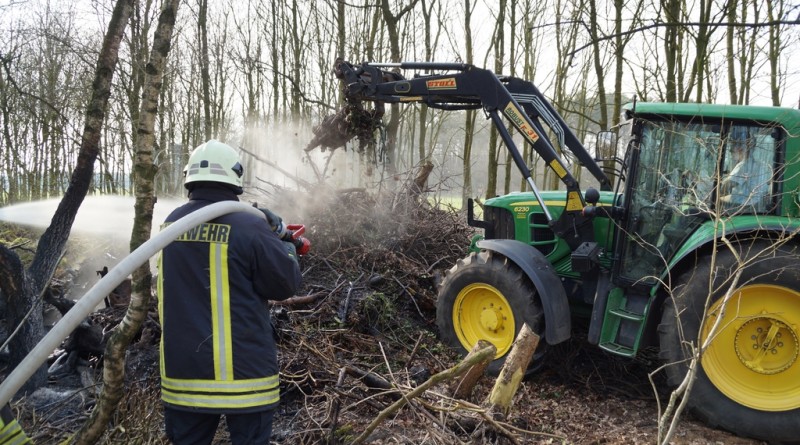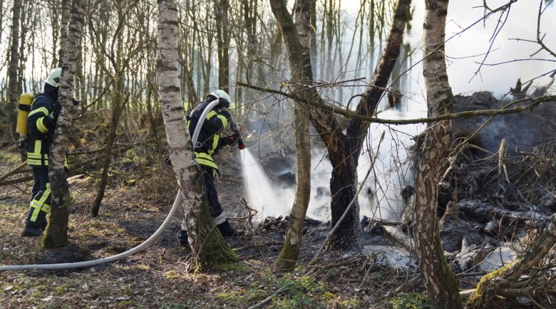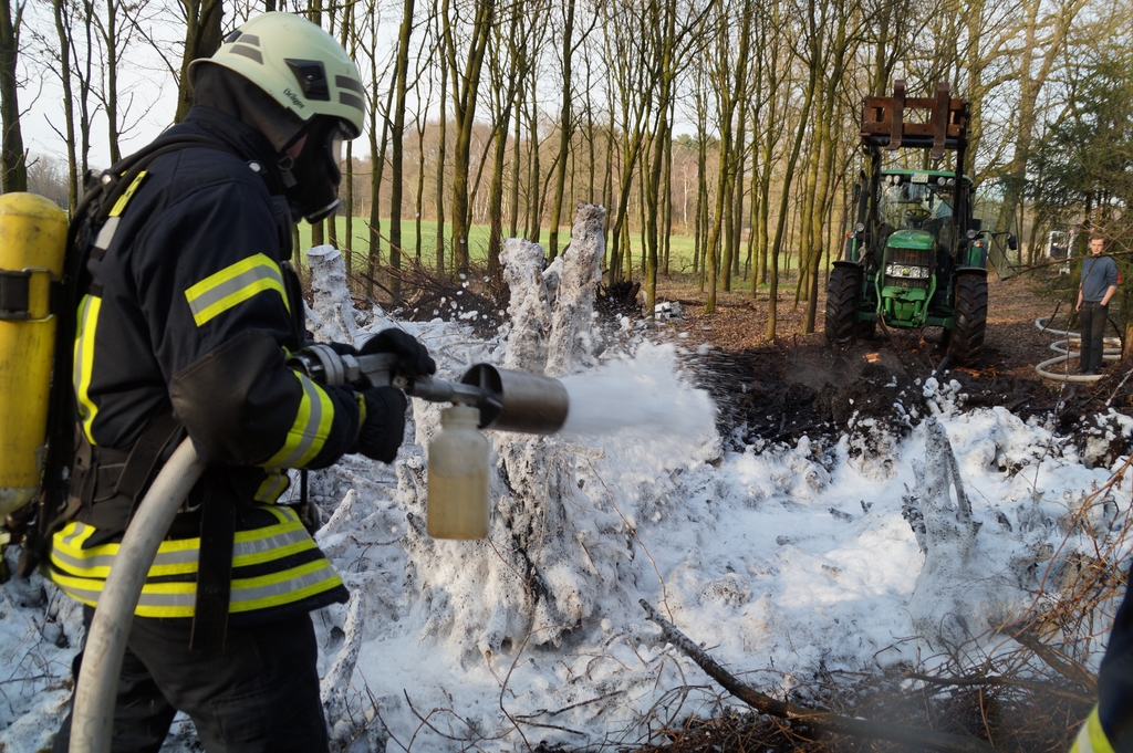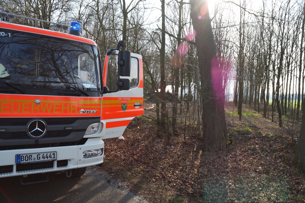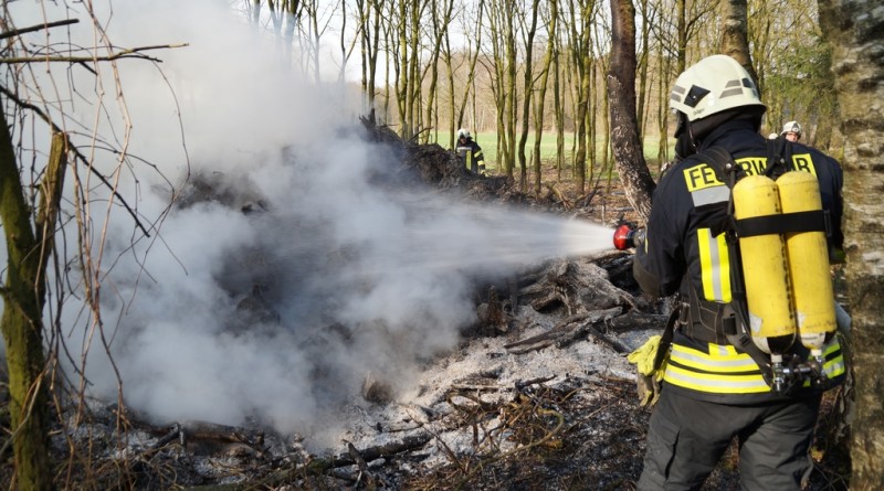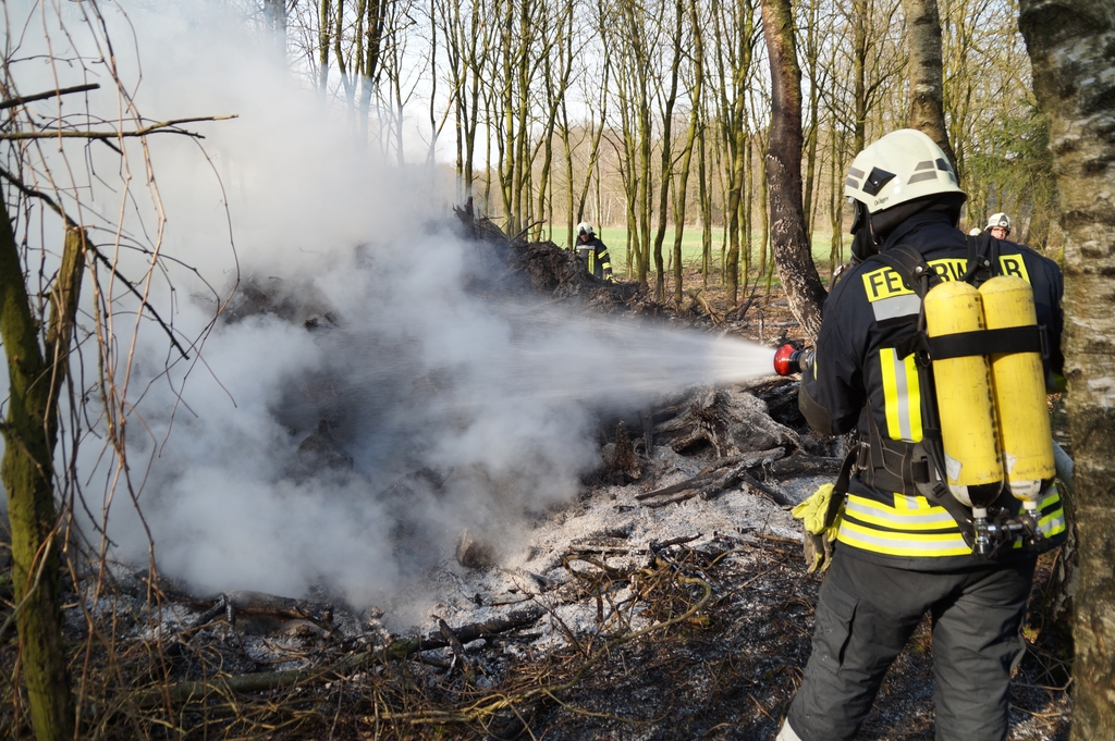 Gegen 17:00 Uhr wurde die Feuerwehr Gescher zu einem Feuer in einem Waldstück gerufen worden. Gemeldet wurde der Brand in der Nähe der L 829, so dass die Kameraden von hier aus anfuhren. Nach einiger Suche fand man das Feuer in einem kleinen Waldstück in der Nähe des „Fünffingerweges“. Dort brannten Baumstümpfe sowie Strauchabschnitte im Wald. Mit zwei C-Strahlrohren wurde das Feuer zunächst abgelöscht. Der hinzugerufene Waldbesitzer hat dann mit einem Traktor die Baumstümpfe auseinanderfahren lassen, so dass die Feuerwehrkameraden den Haufen besser ablöschen konnte. Um ein erneutes Aufflammen zu verhindern wurde der Haufen zum Abschluß mit Schaum abgedeckt. Die Baumstümpfe sowie der Strachabschnitte stammten nicht vom Waldbesitzer und sind illegal im Wald angehäuft worden.