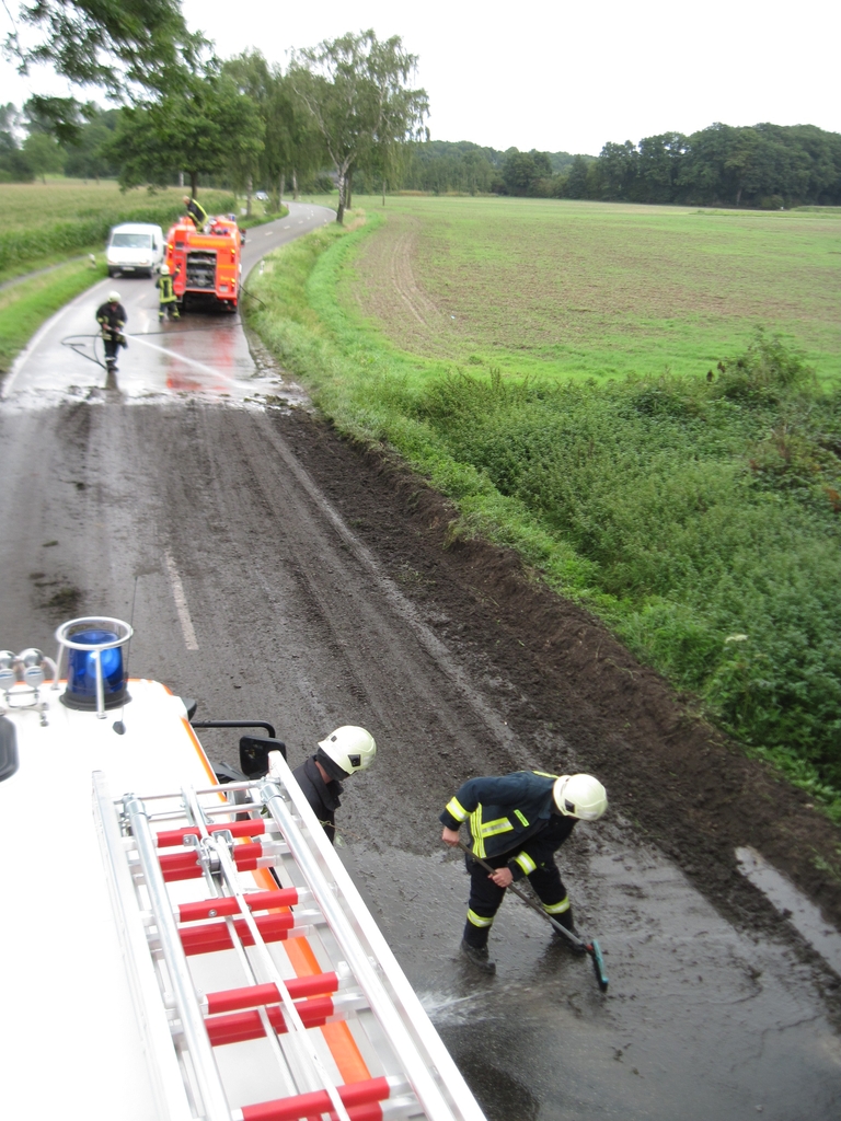 Auf der K30 in Tungerloh-Capellen fuhr ein LKW Fahrer in die Bankette und schleuderte den Dreck auf die Fahrbahn. Anschließend entfernte er sich, so dass der Verursacher unbekannt blieb. Die Fahrbahn wurde in einem schlecht einsehbaren Kurvenbereich verdreckt. So musste die Feuerwehr die Fahrbahn reinigen um die Gefahrensituation zu beseitigen. Der hinzugerufene Kreisbauhof stellte einen Verkehrsleitpfosten wieder auf. Die Bankette wird in den nächsten Tagen wieder hergestellt.