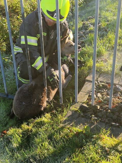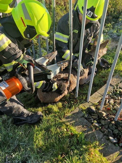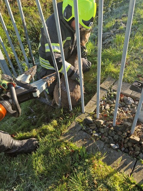 Gegen 9:45 Uhr wurde die Feuerwehr Gescher zu einer Tierrettung auf den Grenzlandring gerufen. Dort steckte ein Reh in einem Stahlrohrzaun auf einem Betriebsgelände fest. Die Feuerwehr konnte mittels hydraulischen Spreizer die Rohre soweit auseinanderdrücken, dass das Reh befreit werden konnte. Da das Reh augenscheinlich unverletzt blieb konnte es wieder in Freiheit entlassen werden.