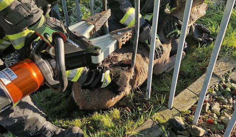 Gegen 9:45 Uhr wurde die Feuerwehr Gescher zu einer Tierrettung auf den Grenzlandring gerufen. Dort steckte ein Reh in einem Stahlrohrzaun auf einem Betriebsgelände fest. Die Feuerwehr konnte mittels hydraulischen Spreizer die Rohre soweit auseinanderdrücken, dass das Reh befreit werden konnte. Da das Reh augenscheinlich unverletzt blieb konnte es wieder in Freiheit entlassen werden.