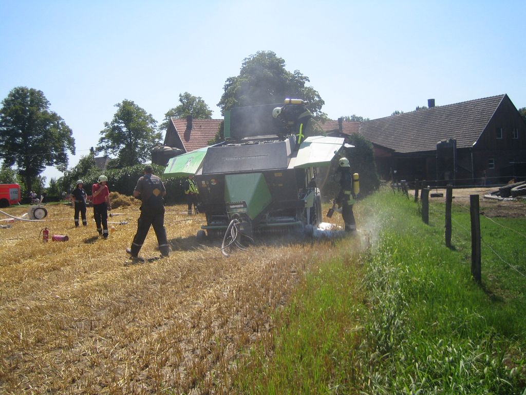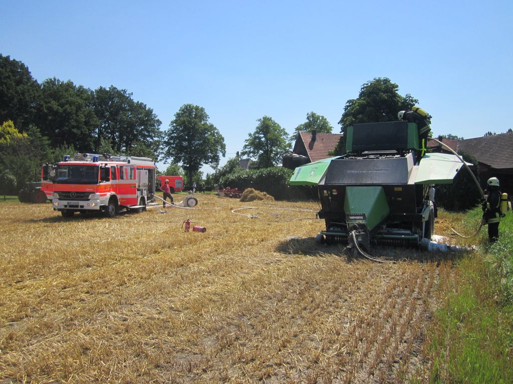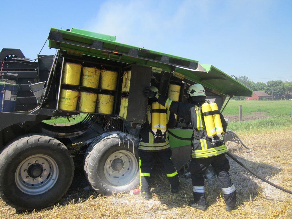 Der Lohnunternehmer hatte bis zum Eintreffen der Feuerwehr das Feuer mit Feuerlöschern klein halten können. Die Feuerwehr löschte dann mit Wasser sowie Schaum unter Atemschutz das brennende Heu. Aufgrund der heißen Termperaturen wurden die Einsatzjacken schnellstmöglich abgelegt. Anschließend wurde die Großballenmaschine per Hand entleert, um auch an die letzten Glutnester zu gelangen. Durch das schnelle Eingreifen des Lohnunternehmers sowie der Feuerwehr konnte größerer Sachschaden verhindert werden.