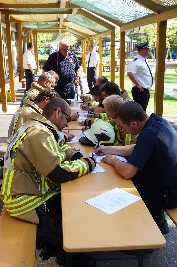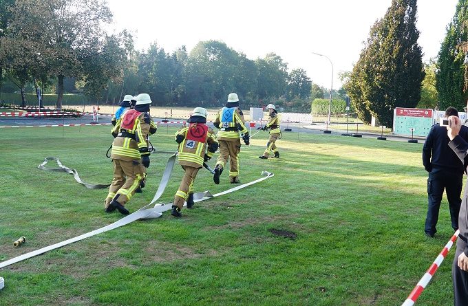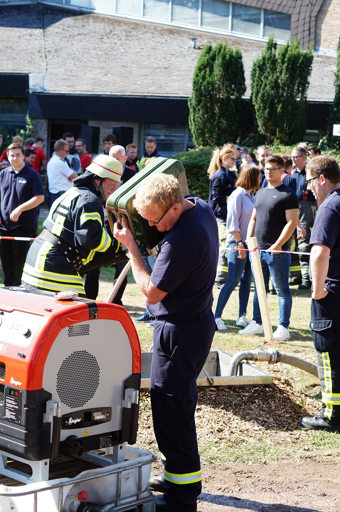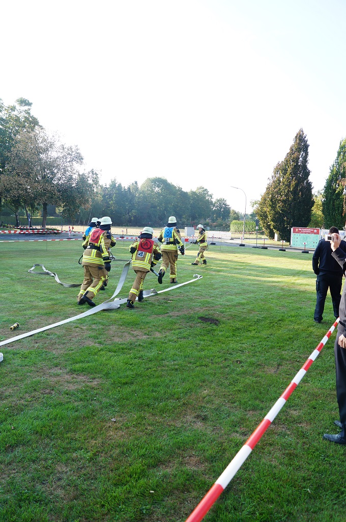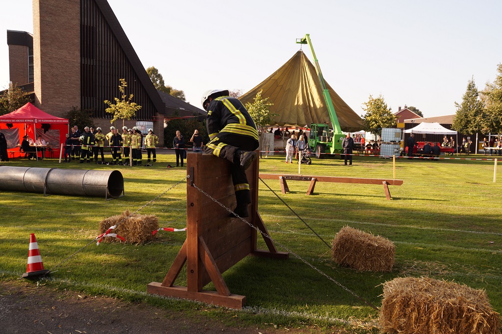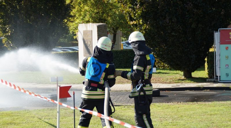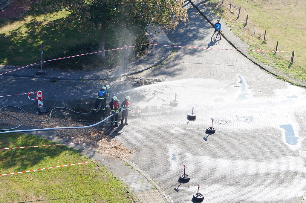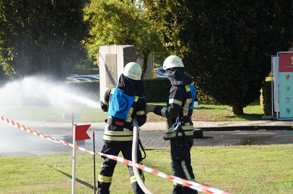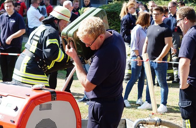 Um 8:30 Uhr ging es dann in der „Grünen Mitte“ und auf dem Gelände der katholischen Kirche mit verschiedenen Aufgabestellungen für die aus 9 Personen bestehenden Gruppen los. Staffel- und Hindernislauf, Löschangriff, Knoten und Stiche sowie eine schriftliche Prüfung im Kindergarten St. Stephanus waren zu bewältigen.