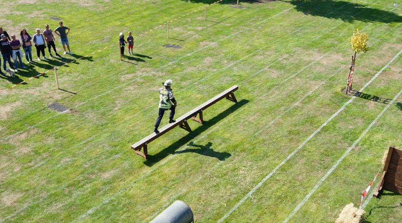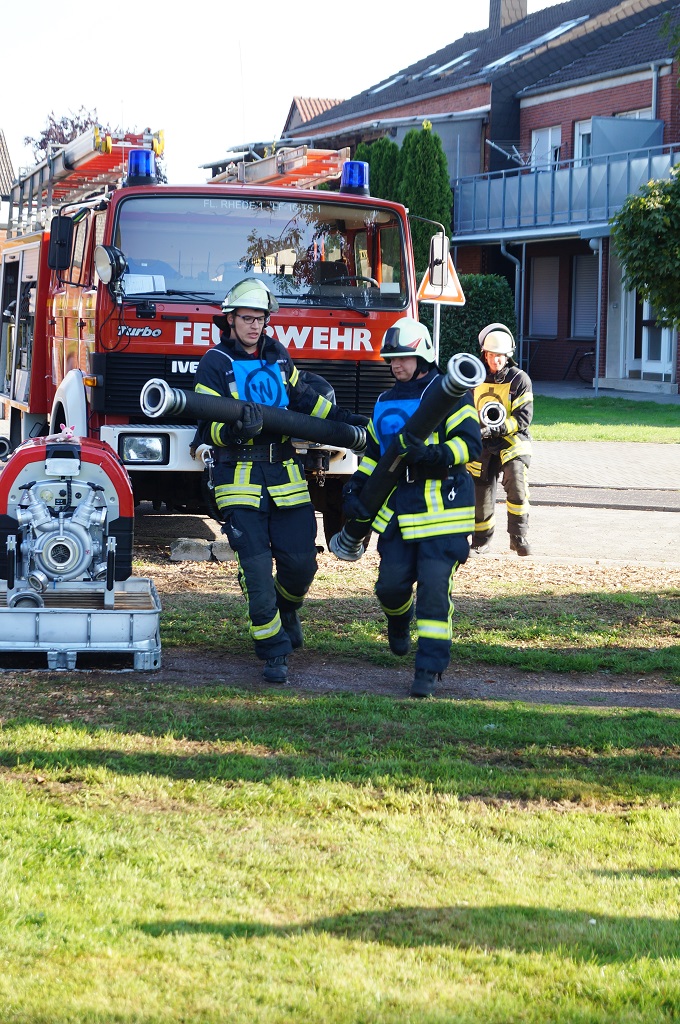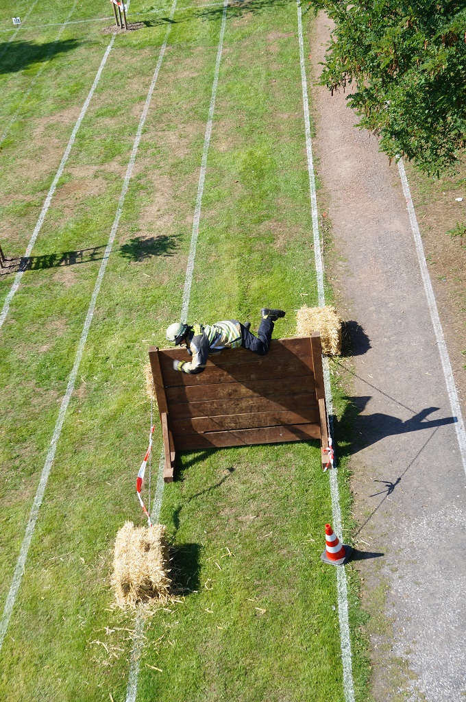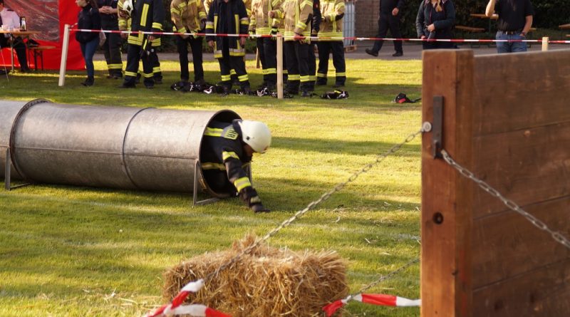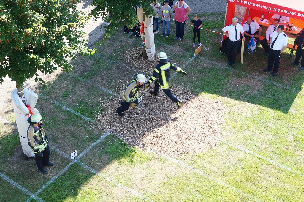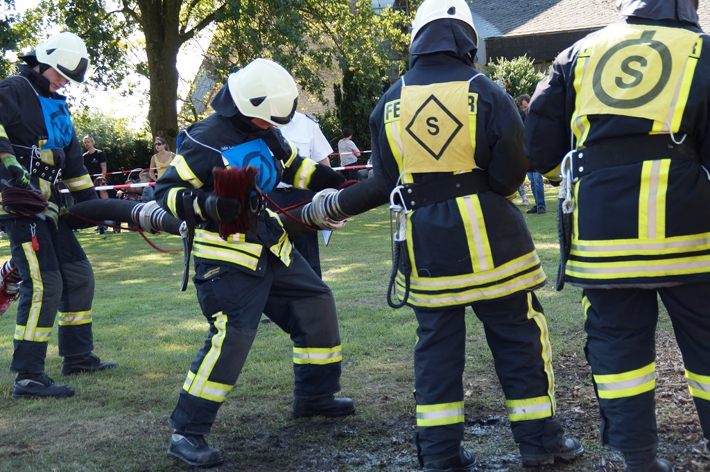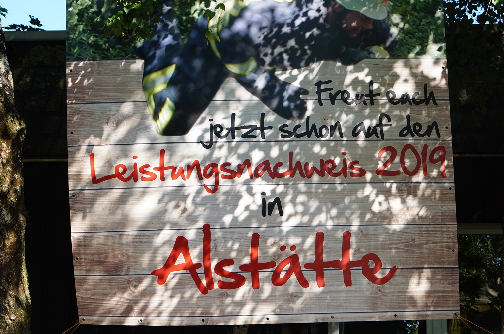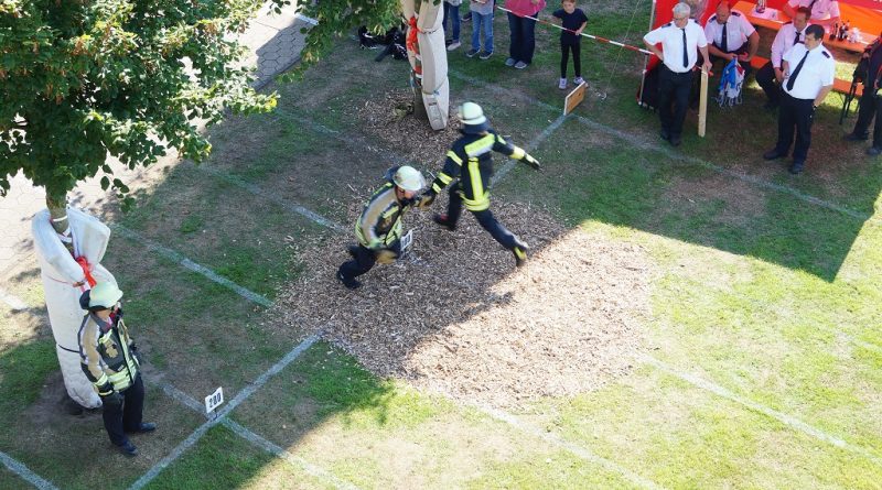 Um 8:30 Uhr ging es dann in der „Grünen Mitte“ und auf dem Gelände der katholischen Kirche mit verschiedenen Aufgabestellungen für die aus 9 Personen bestehenden Gruppen los. Staffel- und Hindernislauf, Löschangriff, Knoten und Stiche sowie eine schriftliche Prüfung im Kindergarten St. Stephanus waren zu bewältigen.