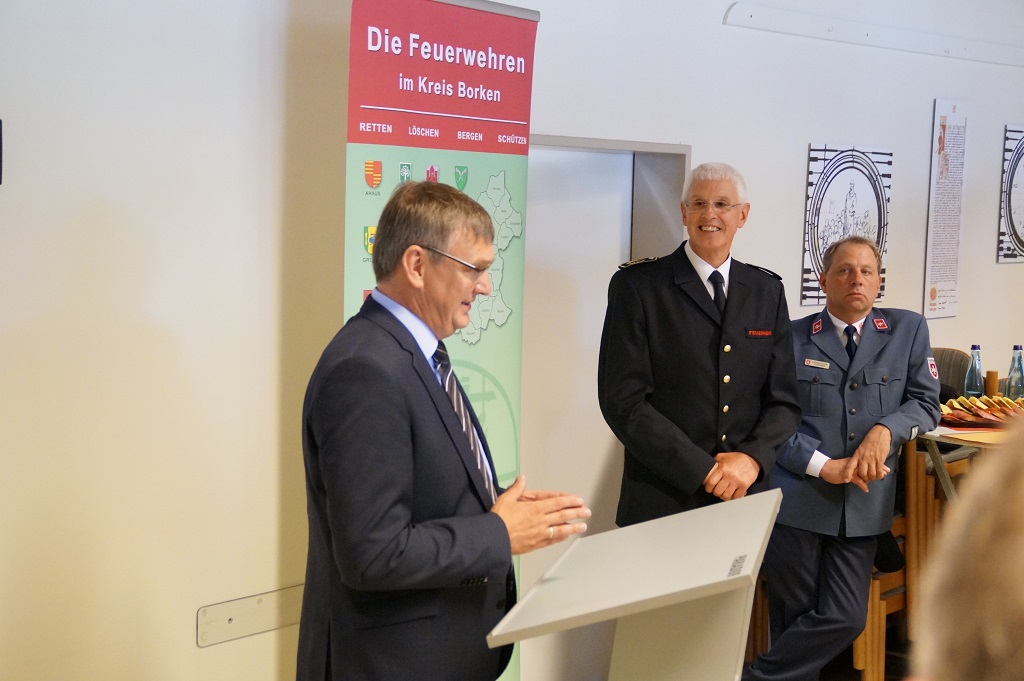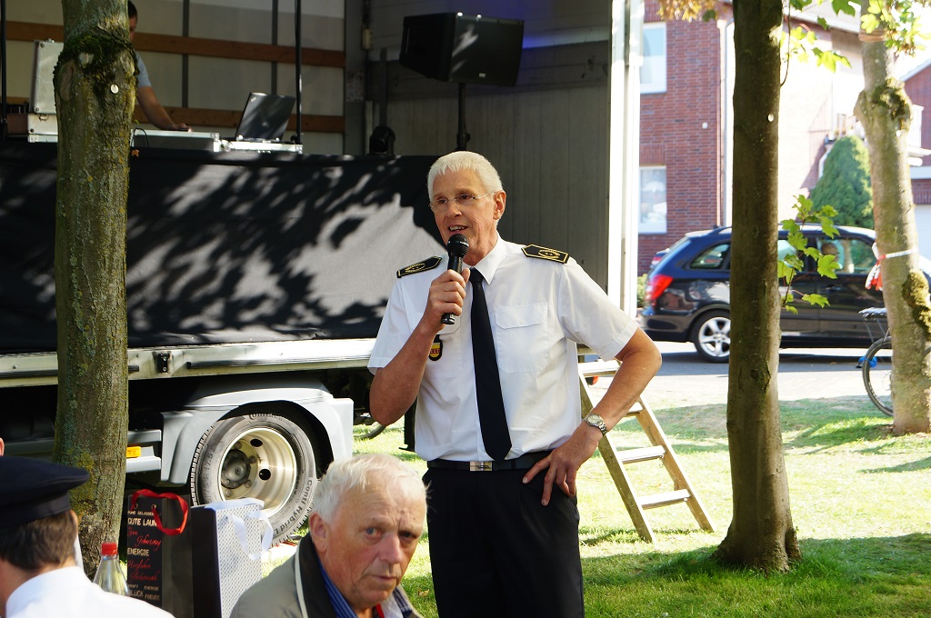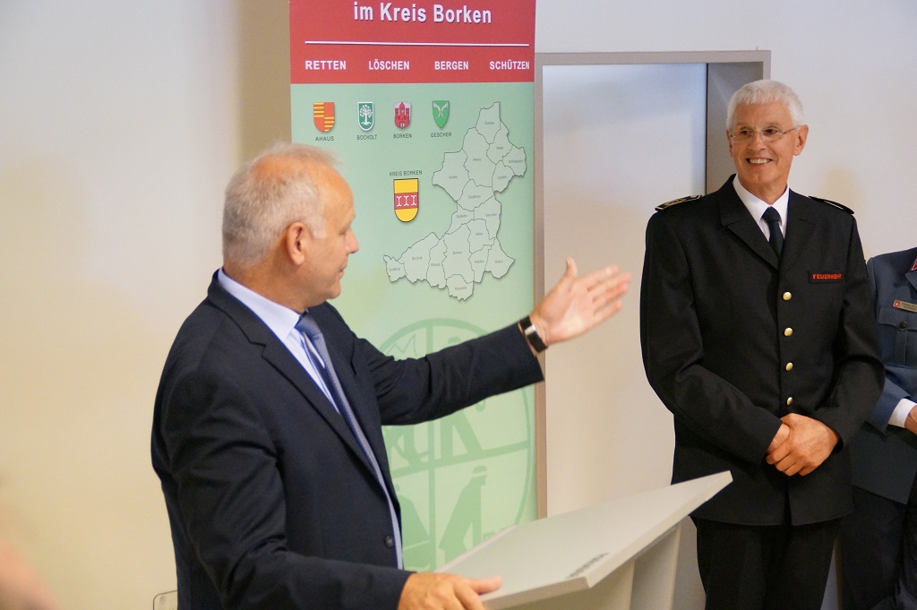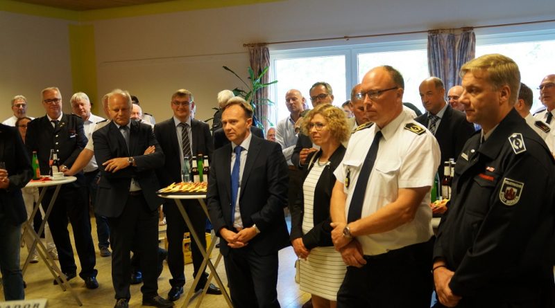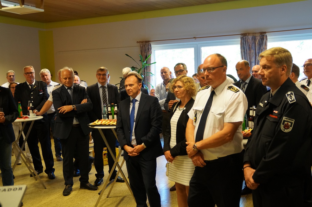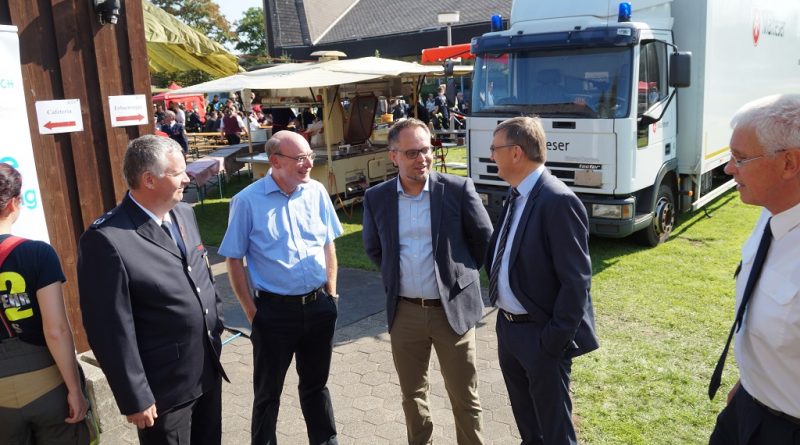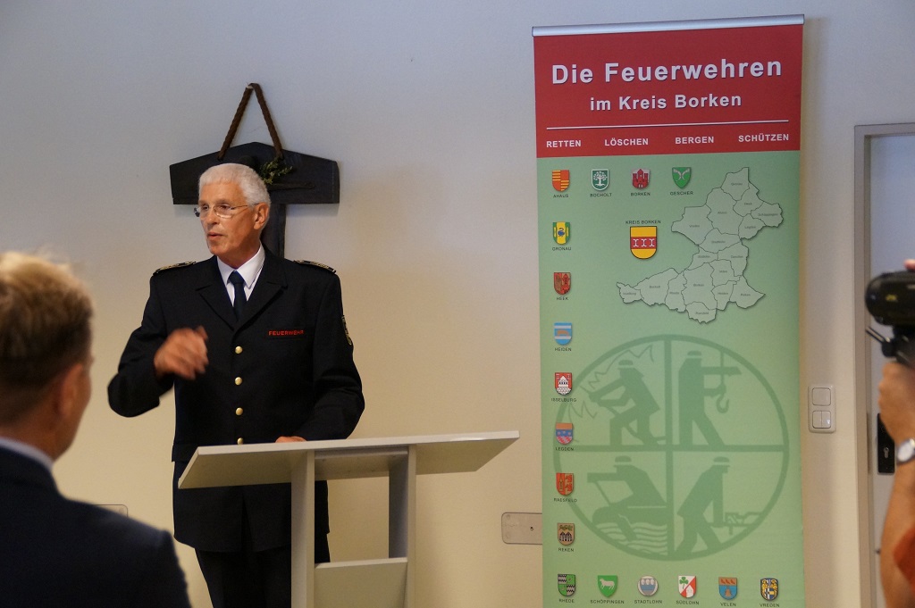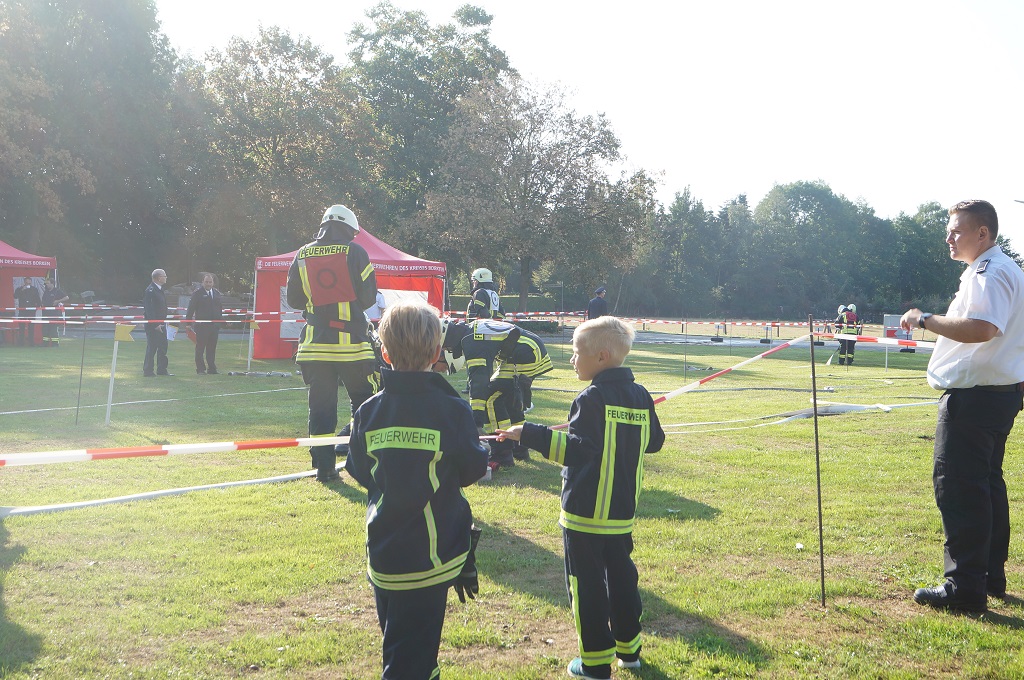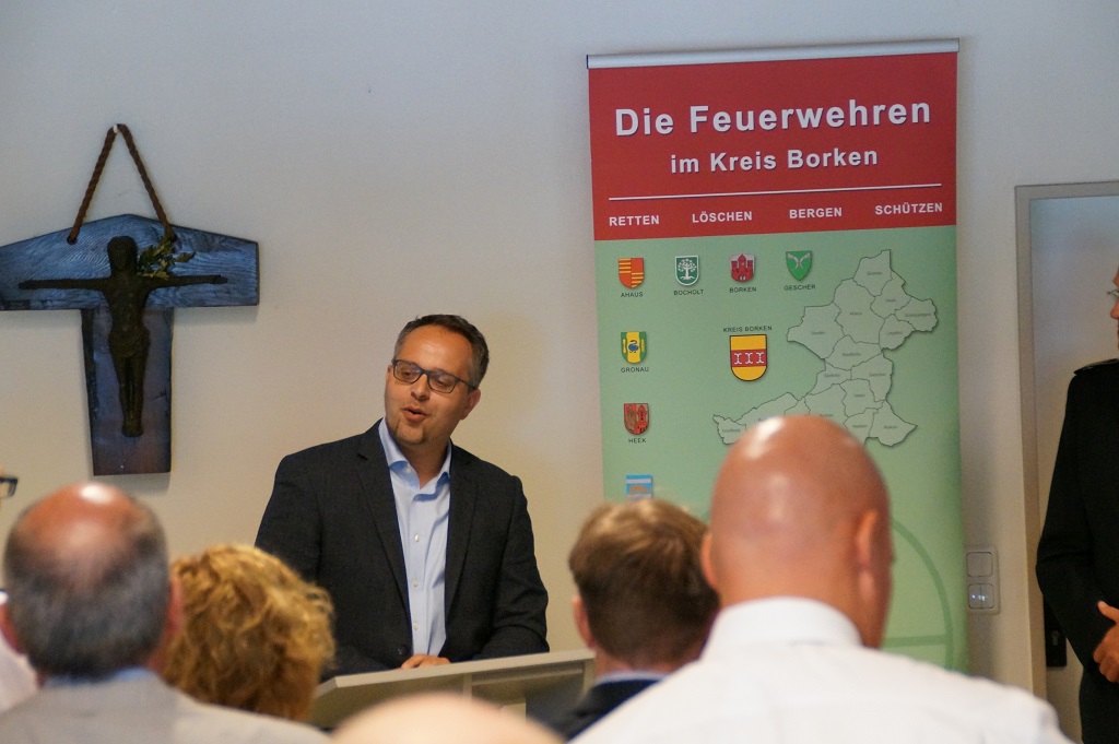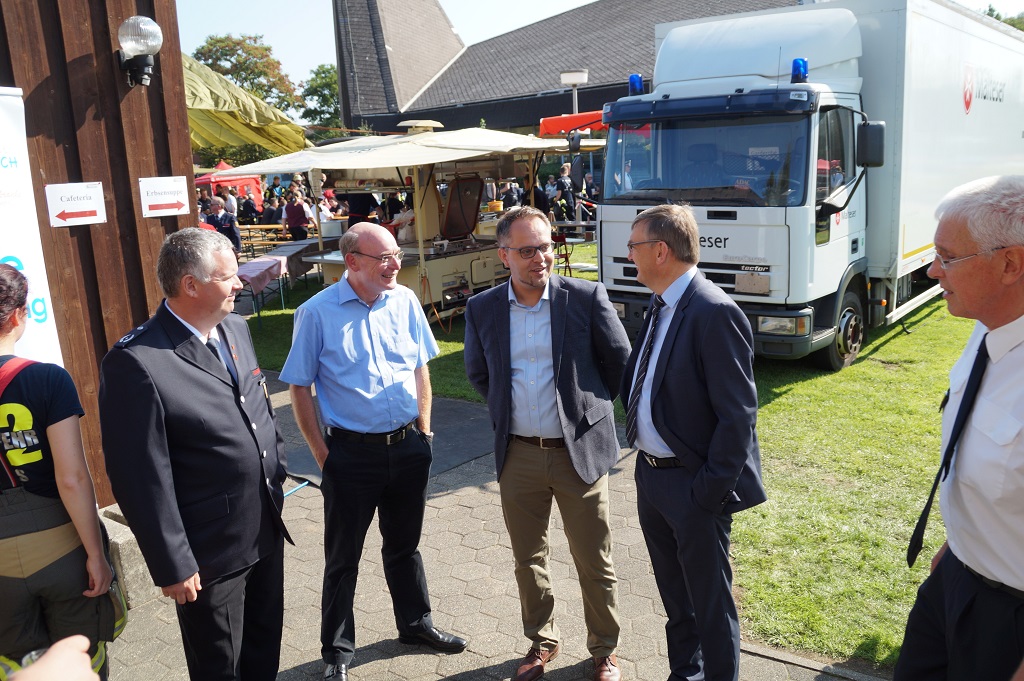 Kreisbrandmeister Johannes Thesing begrüßte zahlreiche geladene Gäste: unter anderem den Bundestagsabgeordneten Johannes Röhring, Landrat Dr. Kai Zwicker, MdL Wilhelm Korth, Bürgermeister Thomas Kerkhoff, Bezirksbrandmeister Donald Niehues und viele andere aus Politik und Feuerwehr. Ganz herzlich bedankte er sich bei den vielen freiwilligen Helfern aus den beteiligten Familien der Feuerwehr Gescher und auch bei der Kirchengemeinde in Hochmoor, die das Gelände bereitwillig zur Verfügung gestellt hatte. In seiner Rede untermauerte Thesing die Bedeutung und Leistungsfähigkeit der 17 Feuerwehren im Kreis Borken mit über 2500 aktiven Mitgliedern und berichtete stolz von der Gründung der ersten Kinderfeuerwehr in Bocholt im Kreis Borken.