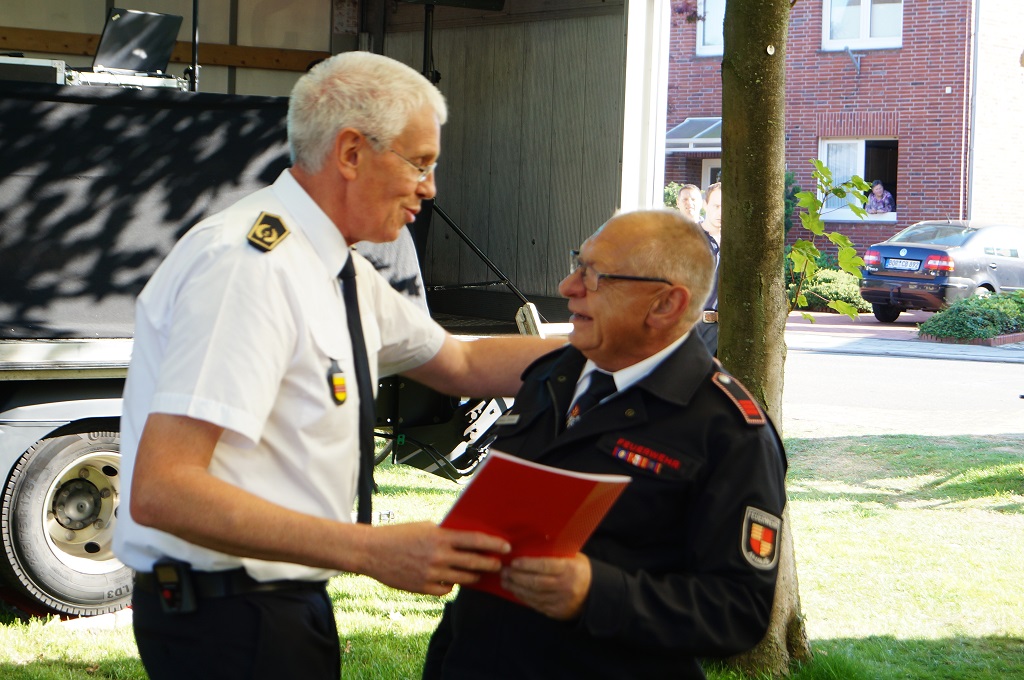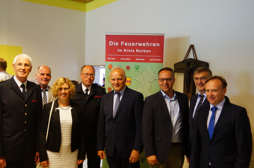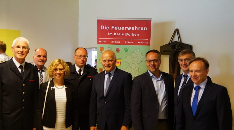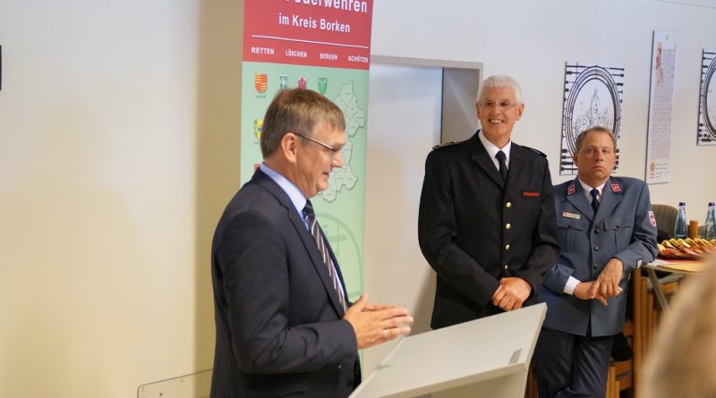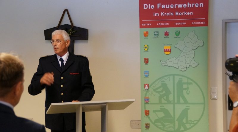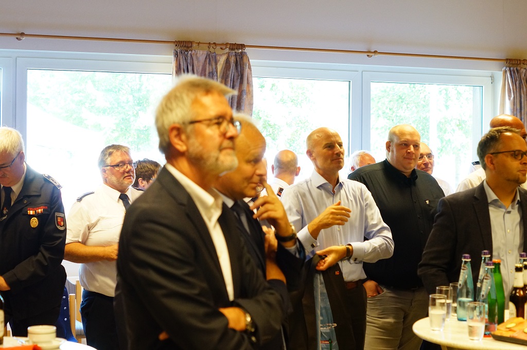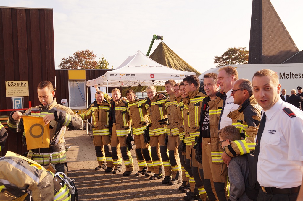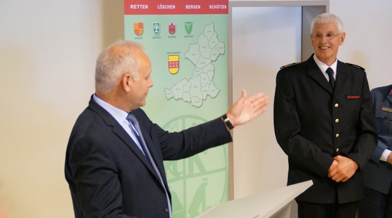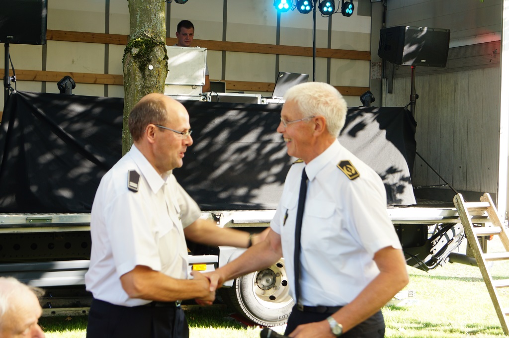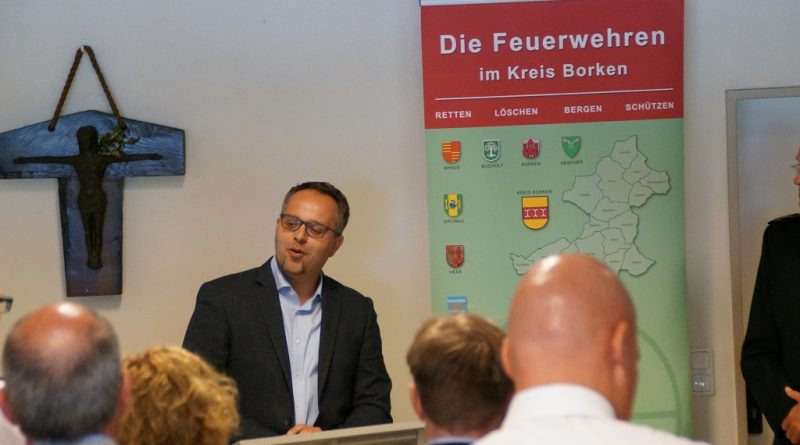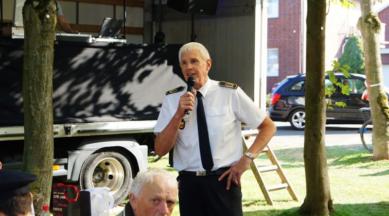 Kreisbrandmeister Johannes Thesing begrüßte zahlreiche geladene Gäste: unter anderem den Bundestagsabgeordneten Johannes Röhring, Landrat Dr. Kai Zwicker, MdL Wilhelm Korth, Bürgermeister Thomas Kerkhoff, Bezirksbrandmeister Donald Niehues und viele andere aus Politik und Feuerwehr. Ganz herzlich bedankte er sich bei den vielen freiwilligen Helfern aus den beteiligten Familien der Feuerwehr Gescher und auch bei der Kirchengemeinde in Hochmoor, die das Gelände bereitwillig zur Verfügung gestellt hatte. In seiner Rede untermauerte Thesing die Bedeutung und Leistungsfähigkeit der 17 Feuerwehren im Kreis Borken mit über 2500 aktiven Mitgliedern und berichtete stolz von der Gründung der ersten Kinderfeuerwehr in Bocholt im Kreis Borken.