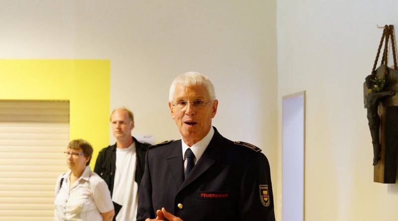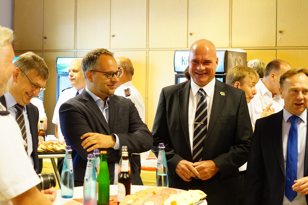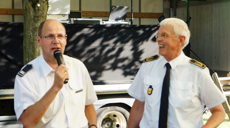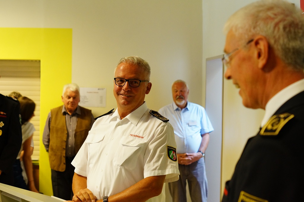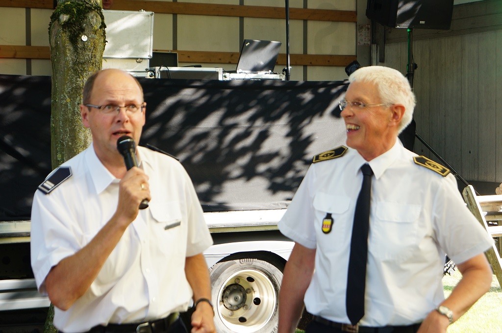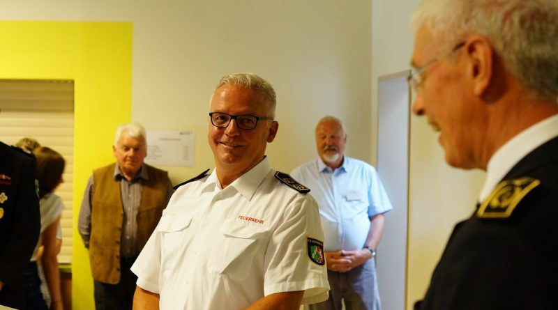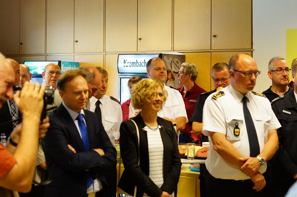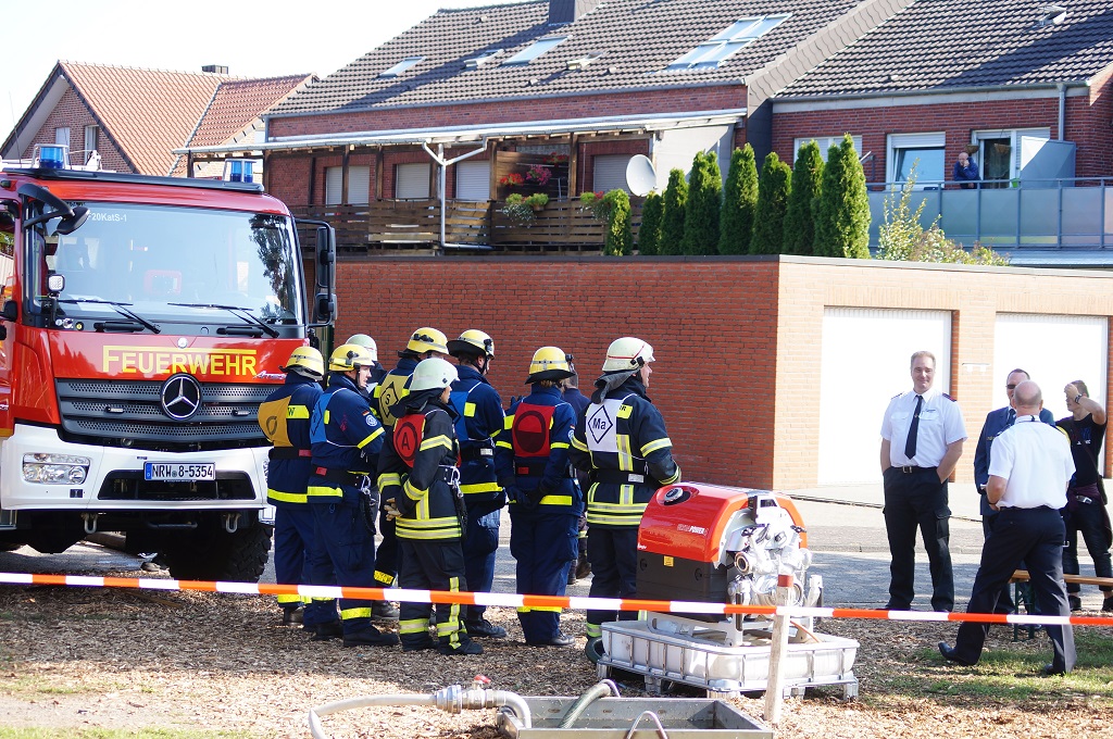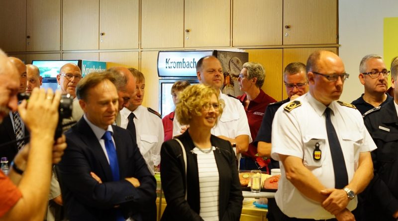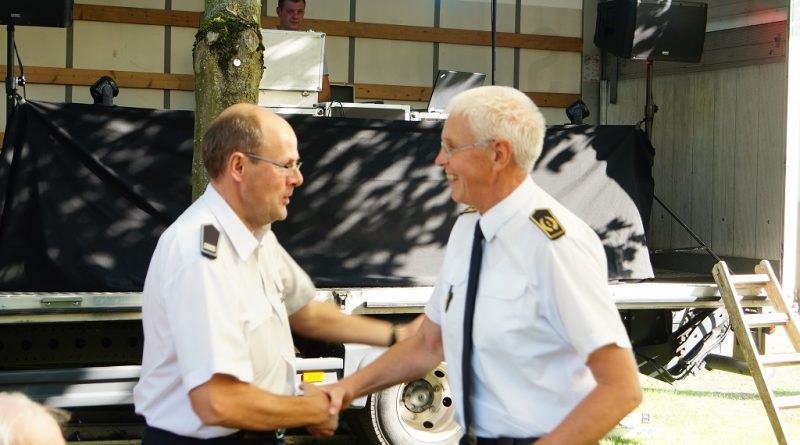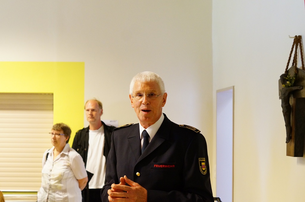 Kreisbrandmeister Johannes Thesing begrüßte zahlreiche geladene Gäste: unter anderem den Bundestagsabgeordneten Johannes Röhring, Landrat Dr. Kai Zwicker, MdL Wilhelm Korth, Bürgermeister Thomas Kerkhoff, Bezirksbrandmeister Donald Niehues und viele andere aus Politik und Feuerwehr. Ganz herzlich bedankte er sich bei den vielen freiwilligen Helfern aus den beteiligten Familien der Feuerwehr Gescher und auch bei der Kirchengemeinde in Hochmoor, die das Gelände bereitwillig zur Verfügung gestellt hatte. In seiner Rede untermauerte Thesing die Bedeutung und Leistungsfähigkeit der 17 Feuerwehren im Kreis Borken mit über 2500 aktiven Mitgliedern und berichtete stolz von der Gründung der ersten Kinderfeuerwehr in Bocholt im Kreis Borken.