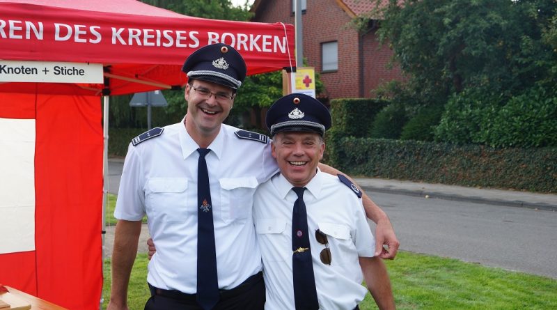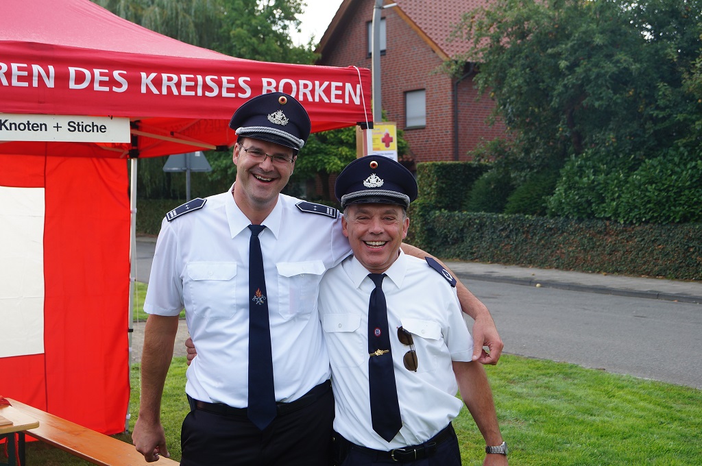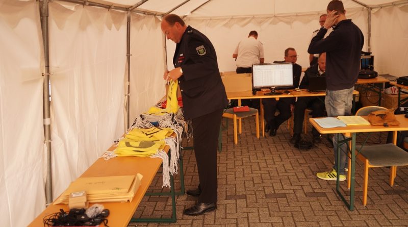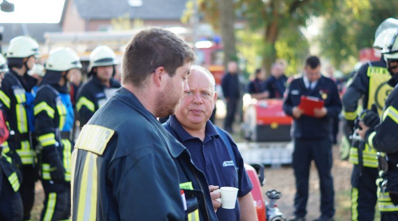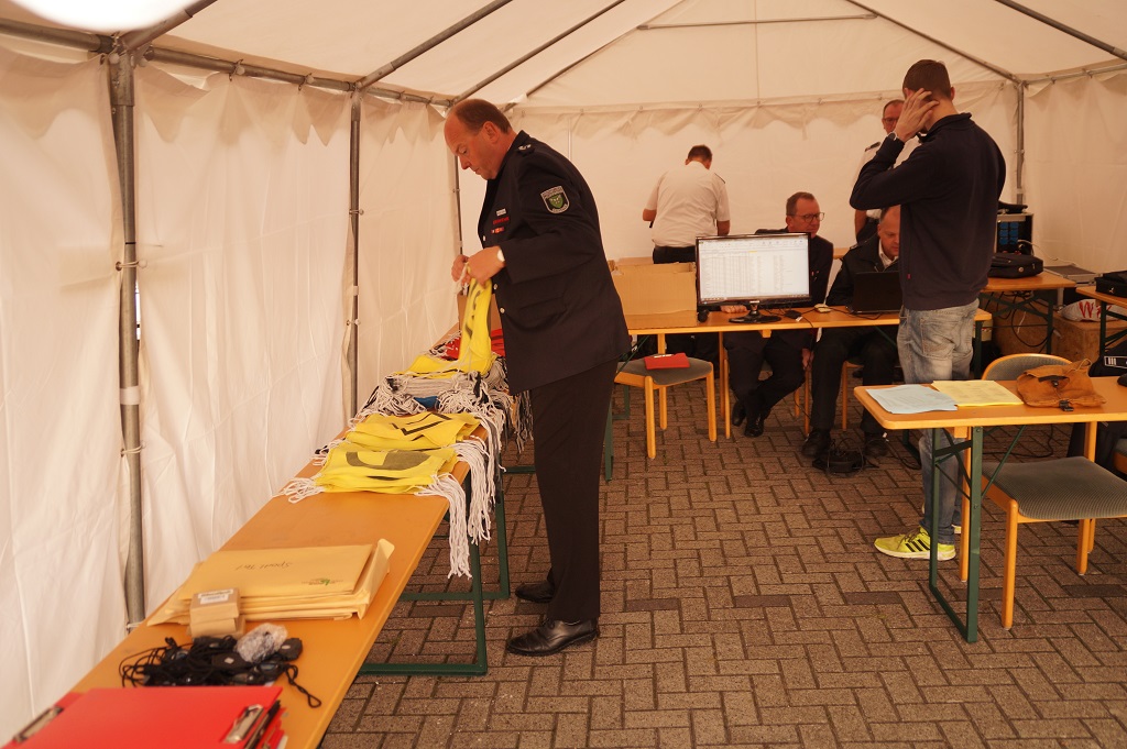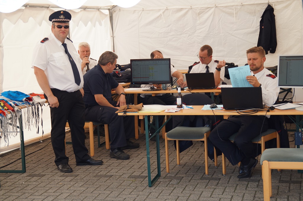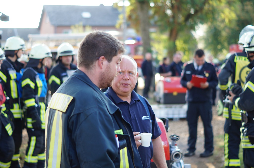 Als Ausrichter des Großereignisses „42. Leistungsnachweis“ der Feuerwehren im Kreis Borken liefen die Vorbereitungen in Hochmoor ja schon seit Tagen auf Hochtouren. Mike Schulz als Löschzugführer und Ludger Grösbrink hatten als Organisationsteam mit dem stellvertretenden Leiter der Feuerwehr Gescher, Dirk Lütkenhaus, ganze Arbeit geleistet. Bürgermeister Thomas Kerkhoff hatte schon am frühen Morgen den Weg nach Hochmoor gefunden und ließ sich von Lütkenhaus die einzelnen Stationen erklären.