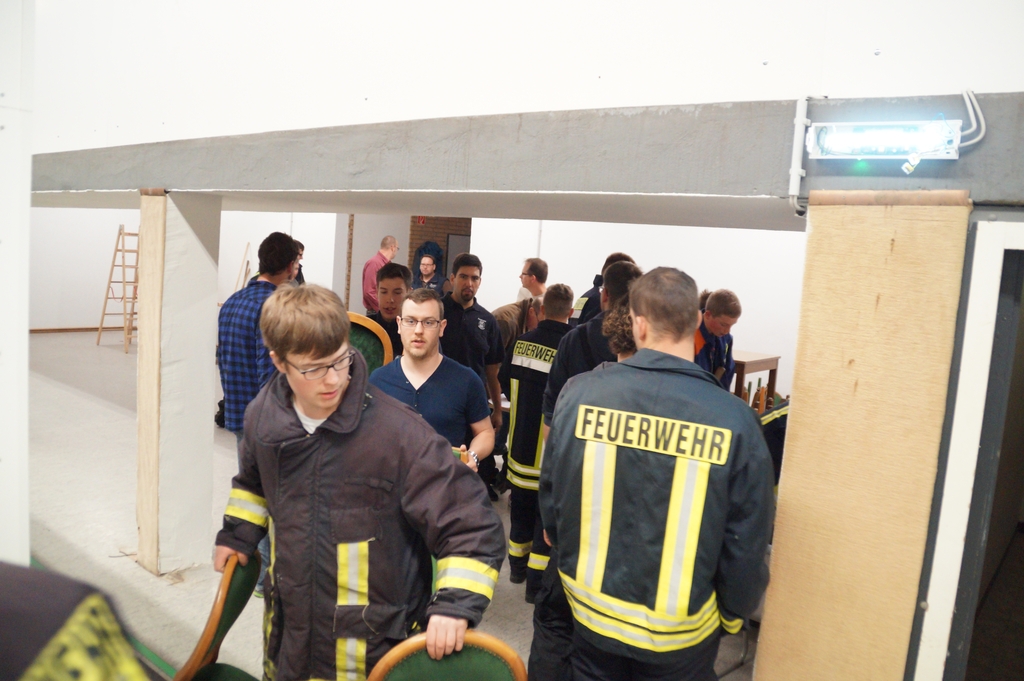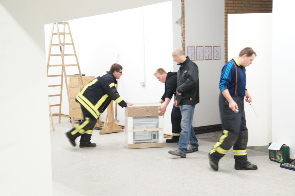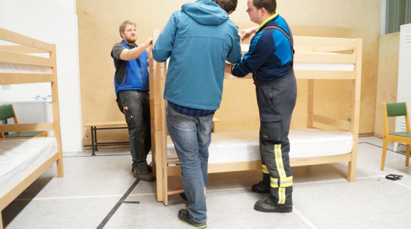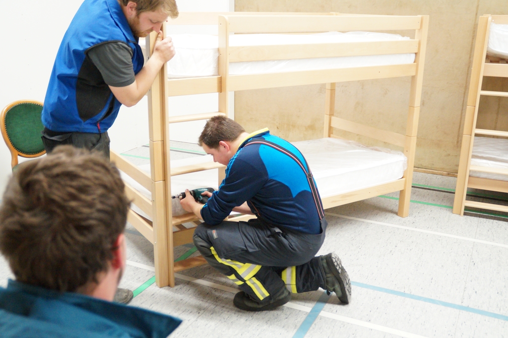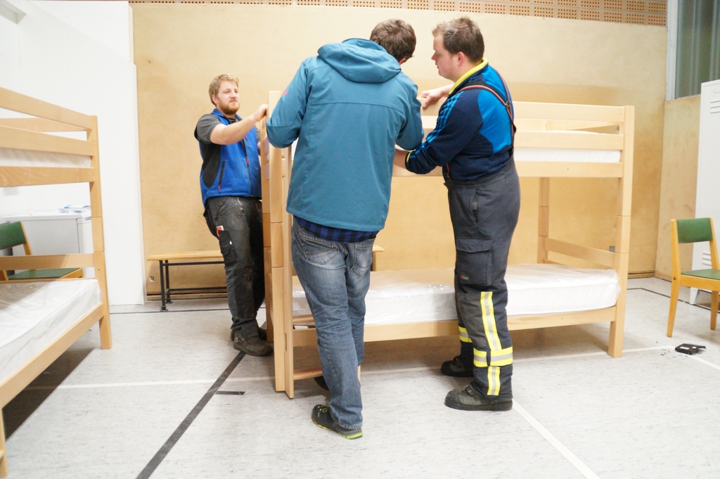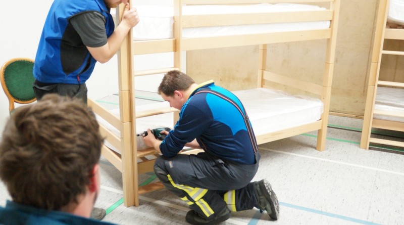 Nachdem die Don Bosco Turnhalle von einer Fachfirma entsprechend umgebaut wurde um eine Unterkunft für Flüchtlinge zu bieten, mussten die Räume noch ausgestattet werden. So trafen sich mehr als 25 Feuerwehrkameraden und Kameradinnen auch aus der Jugendfeuerwehr am Montag abend um die einzelnen Räume entsprechend einzurichten und so den Ordnungsamtsleiter Christian Prost zu unterstützen. So wurden Waschmaschinen und Kühlschränke aufgestellt. Auch wurden Tische und Stühle verteilt und abschließbare Schrankspinde aufgestellt. Zudem mussten einige Betten teilweise zerlegt, umgestellt und wieder aufgebaut werden. Neben der Wohneinrichtung wurden aber auch mehrsprachige Verhaltenshinsweise bei Bränden aufgehangen sowie Feuerlöscher montiert. Die Flüchtlingsunterkunft wird voraussichtlich schon in dieser Woche mit den ersten Flüchtlingen belegt werden.