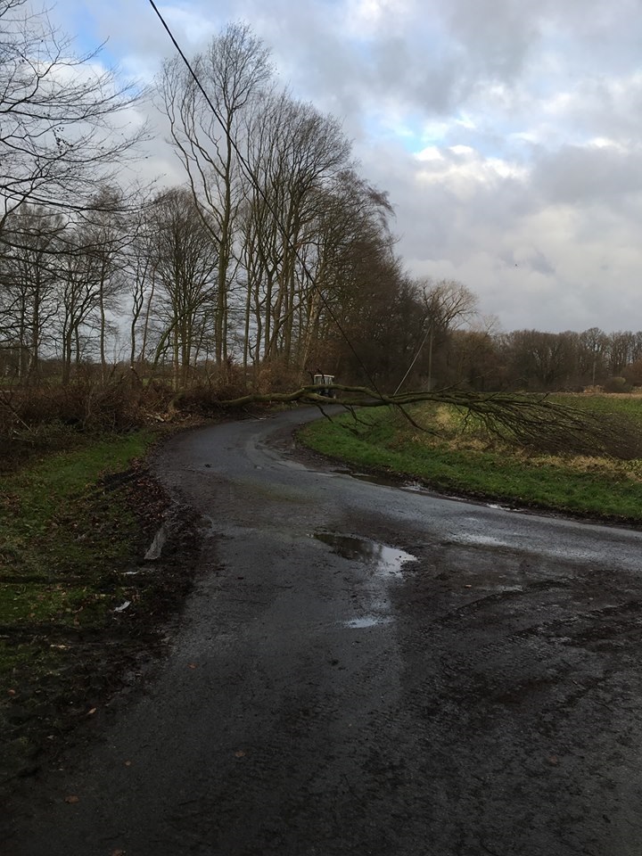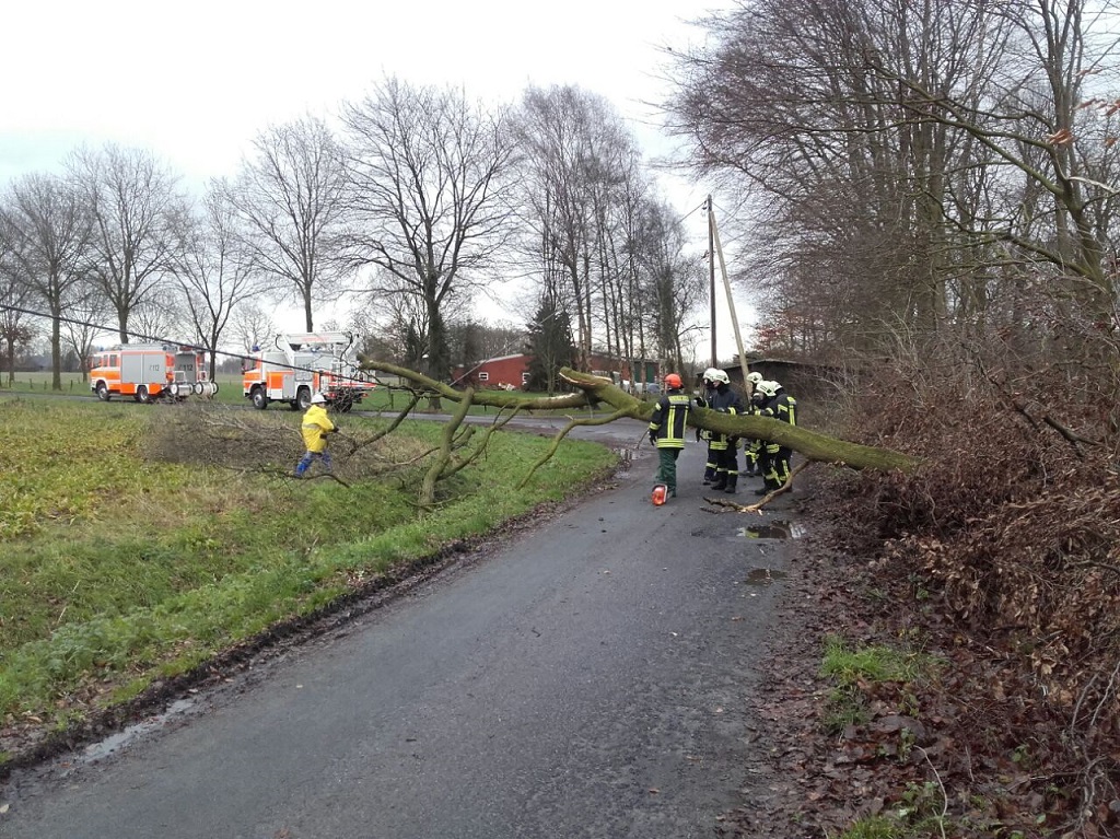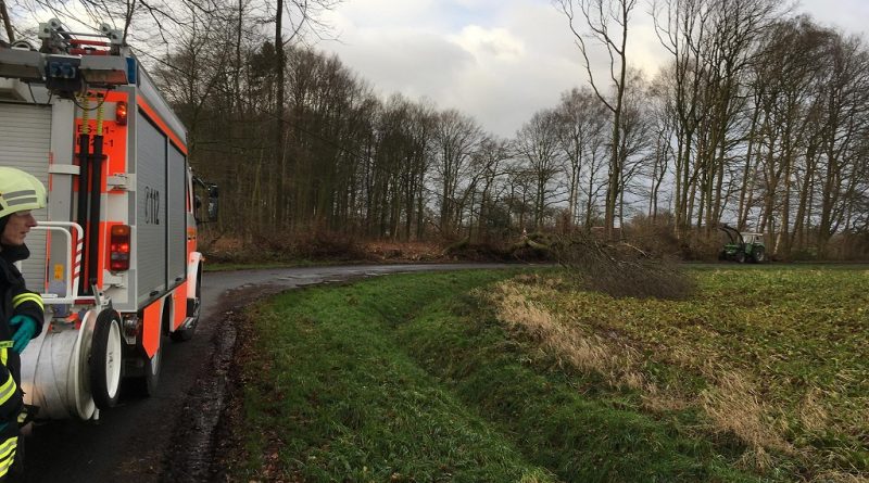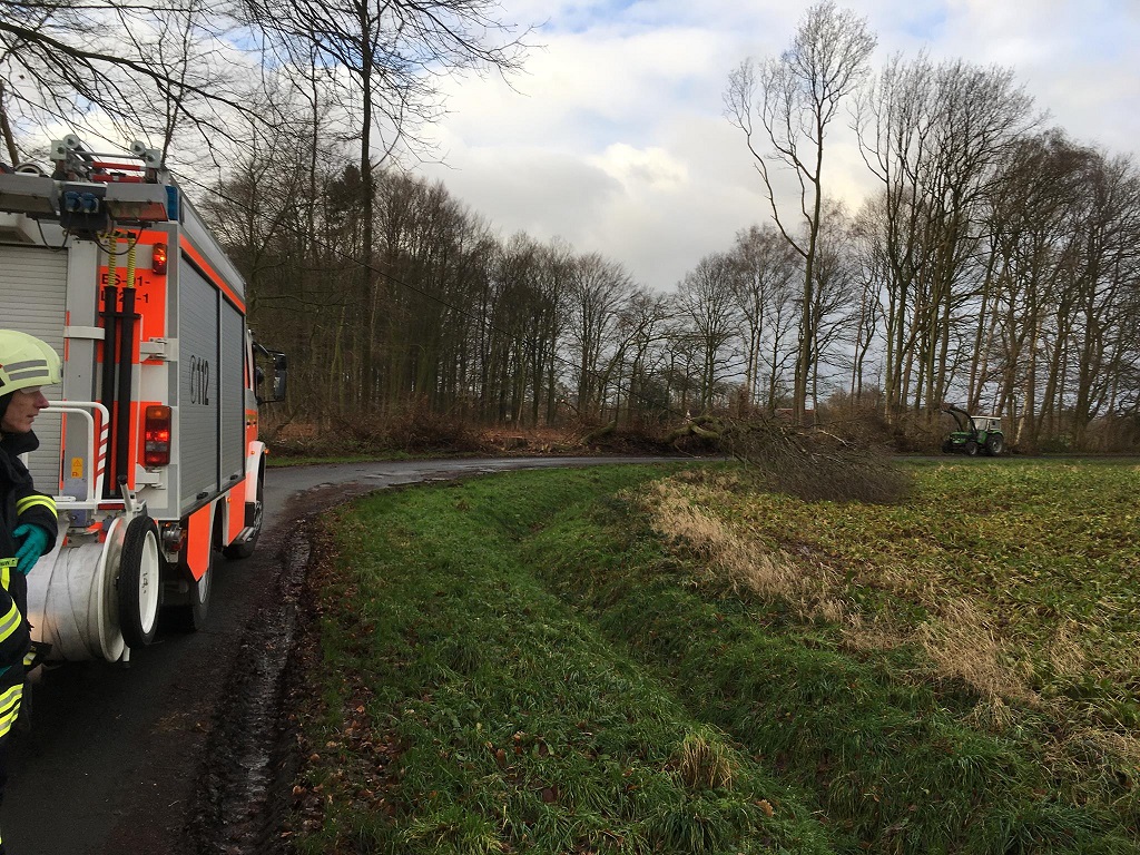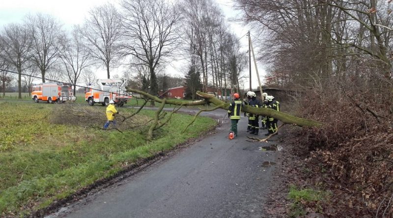 Zu einem umgestürzten Baum musste die Feuerwehr am Mittwoch vormittag ausrücken. Das Sturmtief Burglind hatte in Tungerloh-Capellen einen Baum umgegeweht. Dieser landete über eine Straße in eine Stromleitung. Obwohl die Straße durch den Baum offensichtlich gut versperrt war, mussten einige Autofahrer unvernünftigerweise noch vor Eintreffen der Feuerwehr unter diesem Baum hindurchfahren. Da der Baum nur auf der Stromleitung auflag und der Sturm auch weiter kräftig bließ und so die Stromleitung jederzeit reißen konnte und der Baum weiter auf die Straße fallen konnte war dies eine sehr gefährliche Situation für die Autofahrer. Daher sperrte die Feuerwehr die Straße zunächst und wurde erst tätig als ein Mitarbeiter der Westnetz die Stromleitung stromlos schaltete. Anschließend konnte der Baum Stück für Stück beseitigt werden, so dass die Leitung unbeschadet blieb.