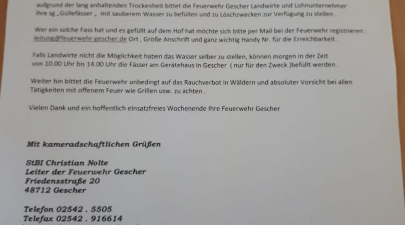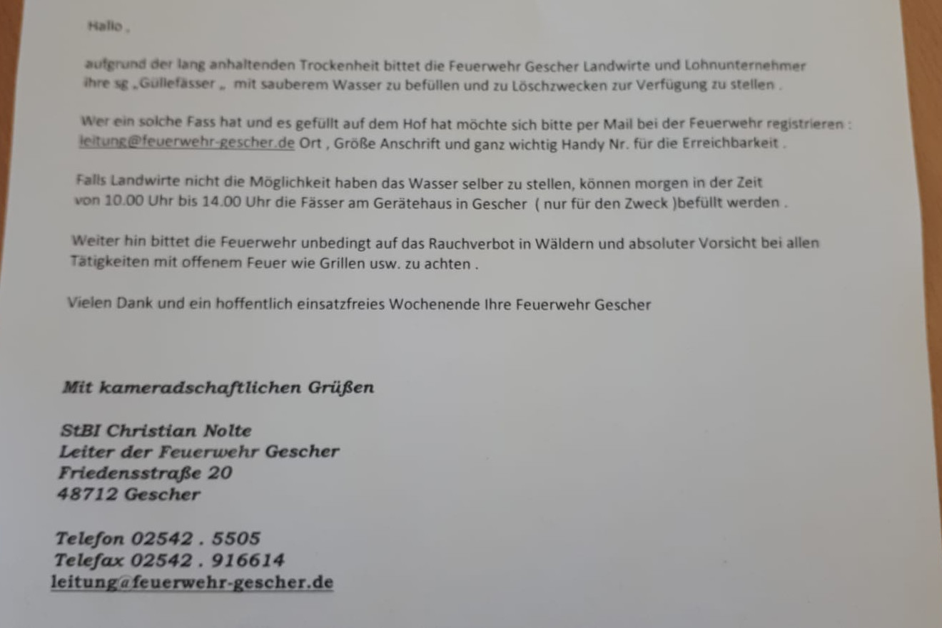 Aufgrund der langandauernde Trockenheit hat die Feuerwehr überlegt was man bei einem Wald- oder Flächenbrand tun könnte. So rief Stadtbrandinspektor Christian Nolte in einem offenen Brief die Gescheraner Landwirte um Unterstützung auf.
