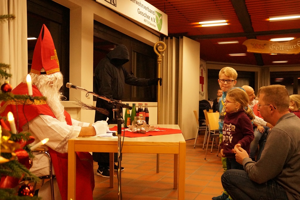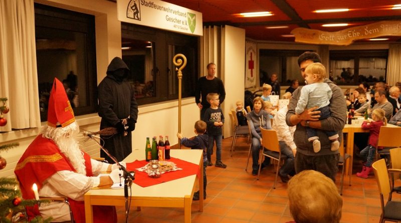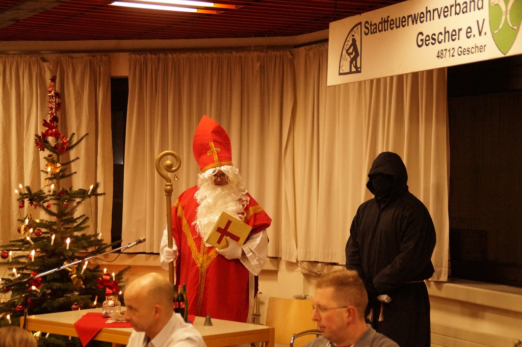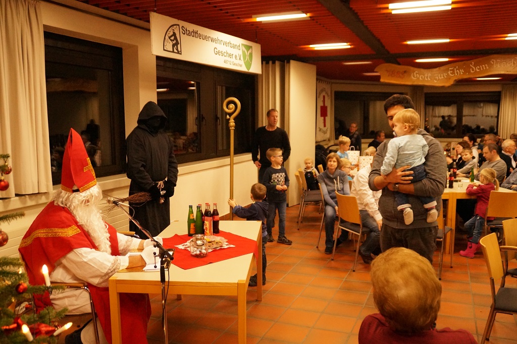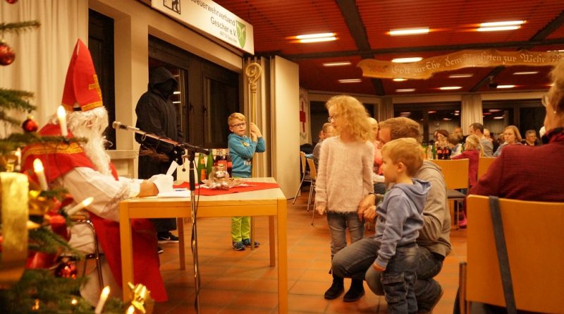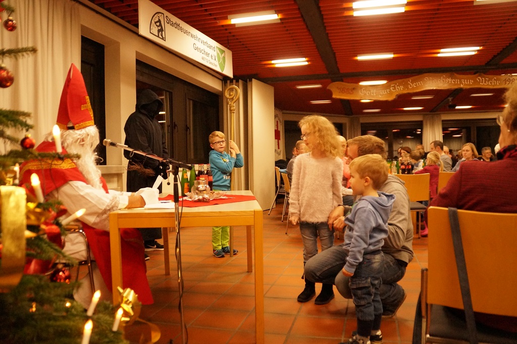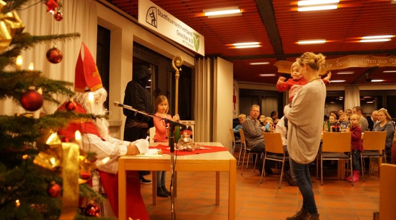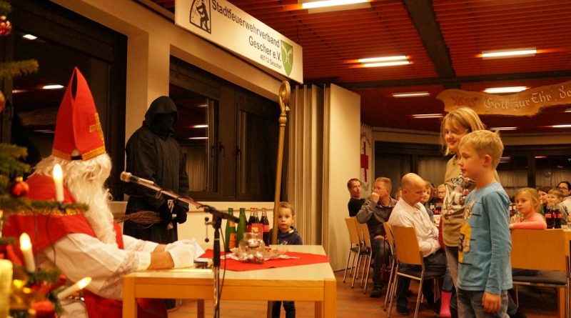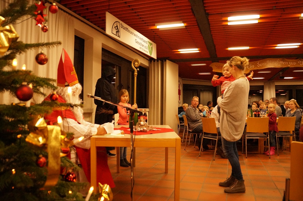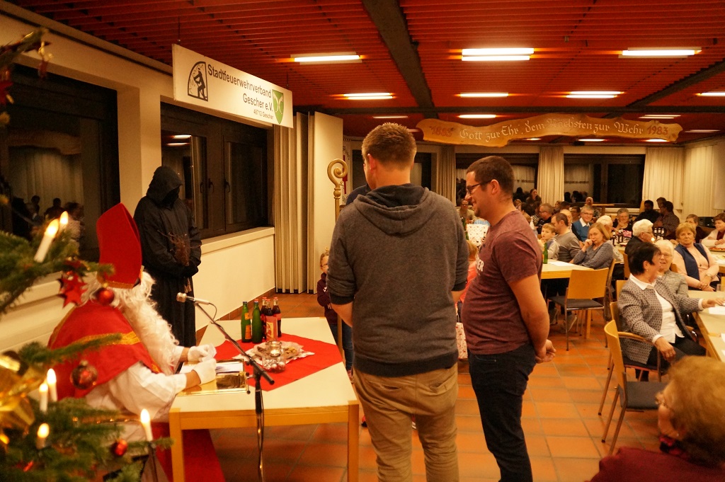 Da der Nikolaus am 06.12. schon stark beschäftigt ist, besuchte der Nikolaus bereits am vergangenen Sonntag die Feuerwehr. Der Nachmittag begann zunächst mit der Weihnachtsfeier der Alters- und Ehrenabteilung. Gegen Abend kamen die Feuerwehrkameraden mit Ihren Familien hinzu. Gemeinsam wurde das Lied „Nikolaus komm in unser Haus“ angestimmt und so musste man nicht mehr lange warten und konnte den Nikolaus und den Ruprecht im Feuerwehrgerätehaus begrüssen. Der Nikolaus hatte sowohl Lob wie auch Tadel für die Kinder der Feuerwehr wie auch für einige aktive Feuerwehrmänner über das ganze Jahr gesammelt und sogar aus der Alters- und Ehrenabteilung hatte er zu berichten. So konnten sich die Kinder der Feuerwehrkameraden nach und nach eine Tüte vom Nikolaus abholen. Nach einem weiteren Weihnachtslied und einem Gedicht musste der Nikolaus auch schon zu seinem nächsten Termin aufbrechen.