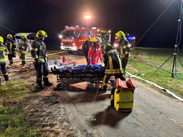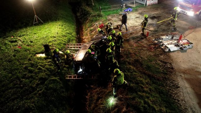 Eine Person war unter dem Fahrzeug eingeklemmt, eine weitere im Fahrzeug eingeschlossen. Während der technischen Rettung stellte sich heraus, dass sich auch ein Kleinkind im Fahrzeug befand, das beim Aufprall herausgeschleudert wurde. Sofort begann eine großflächige Umfeldsuche mit der Wärmebildkamera – eine Wärmeflasche an einer Übungspuppe diente hier als realistischer Wärmespot.