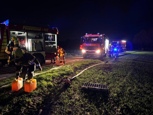 24 Einsatzkräfte der Feuerwehr mit HLF 10, LF 20 Kats und Logistikfahrzeug,