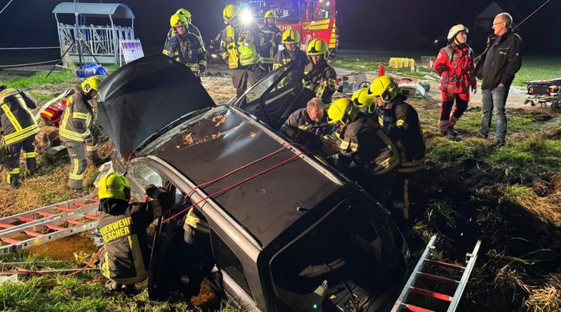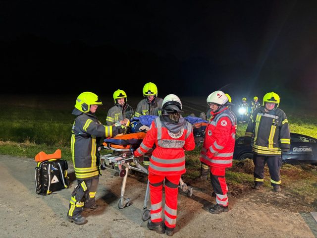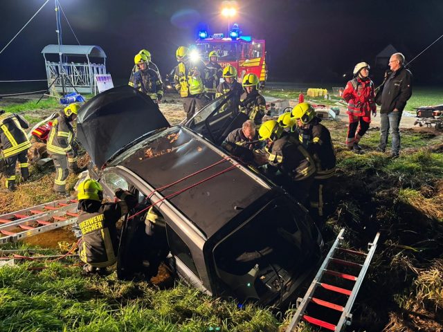 Mit Leitern wurde der Graben gesichert, anschließend begann die patientengerechte Rettung unter erschwerten Bedingungen. Das Fahrzeugdach musste abgenommen werden, um die verletzte Person so schonend wie möglich zu befreien. Als sich der Zustand des Fahrers verschlechterte, erfolgte die Sofortrettung.