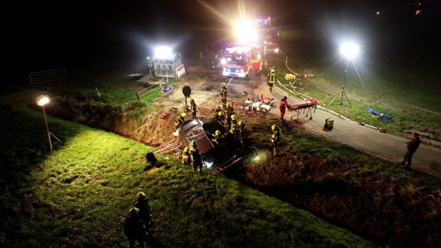 Ein Pkw hatte in der Dunkelheit eine Fußgängerin erfasst und war anschließend seitlich in einen Graben geraten. Der Wagen begann zu rauchen (dargestellt mit Rauchbomben) – ein Entstehungsbrand drohte.