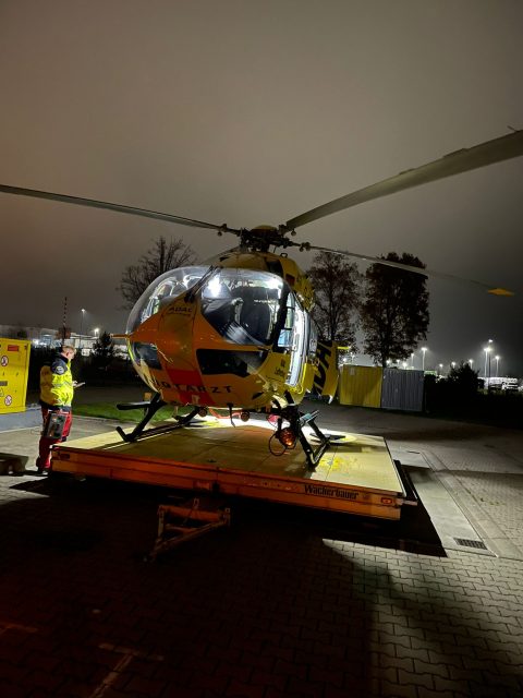 Ein Kleinkind musste mit starken Atemproblemen ins Krankenhaus transportiert werden. Der Rettungshubschrauber (RTH) war bei Eintreffen bereits gelandet und ließ einen Teil der Besatzung und diverse Ausstattung an der Einsatzstelle, um aufgrund der voranschreitenden Dämmerung direkt den Rückflug anzutreten. Aufgrund der benötigten Ausstattung aus dem RTH übernahm die Helikopter Besatzung die Versorgung des Patienten während des Transports im Rettungswagen (RTW) zum Uniklinikum Münster, während die verbleibende Besatzung des RTW und weiteres medizinisches Gerät mit einem Mannschaftstransportwagen der Feuerwehr mit Sonderrechten nachgeführt wurde. Nachdem der Patient übergeben werden konnte, wurde die Besatzung des RTH zurück zum Stützpunkt in Greven transportiert.