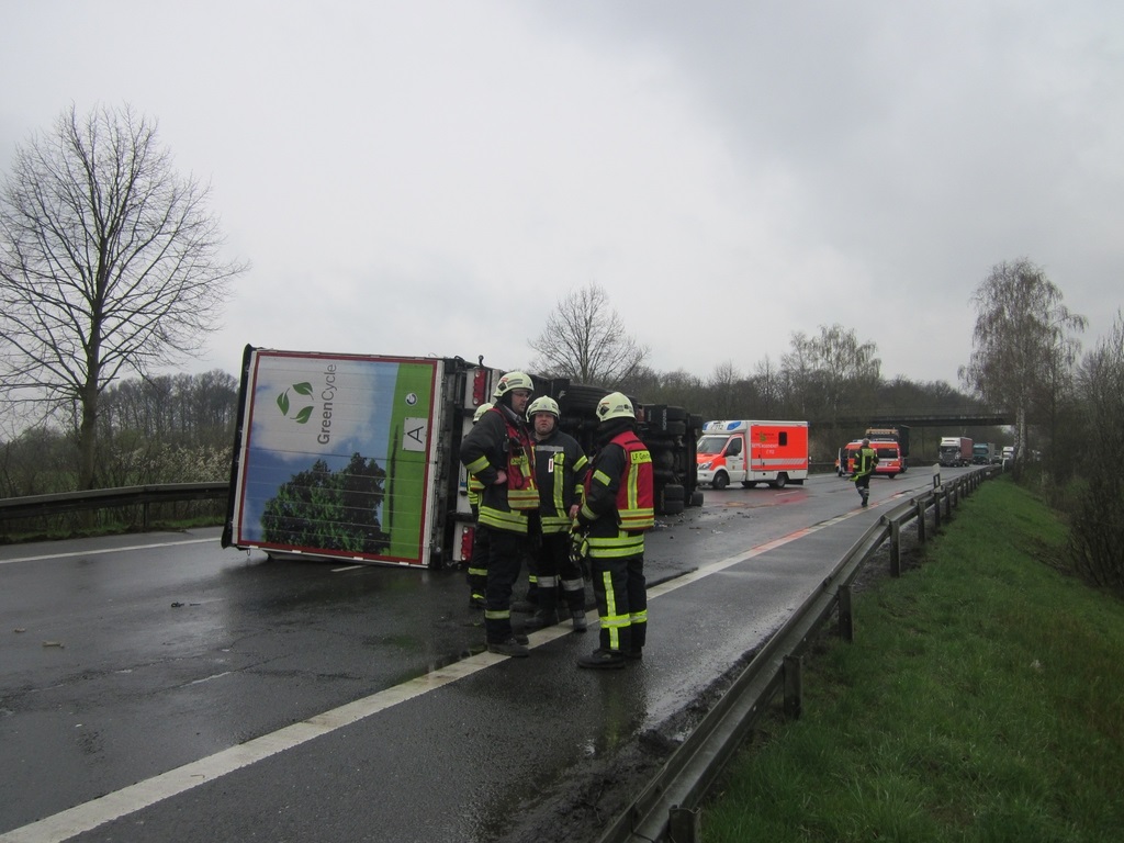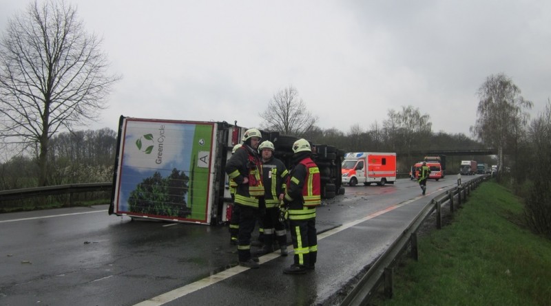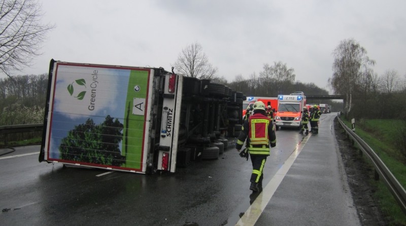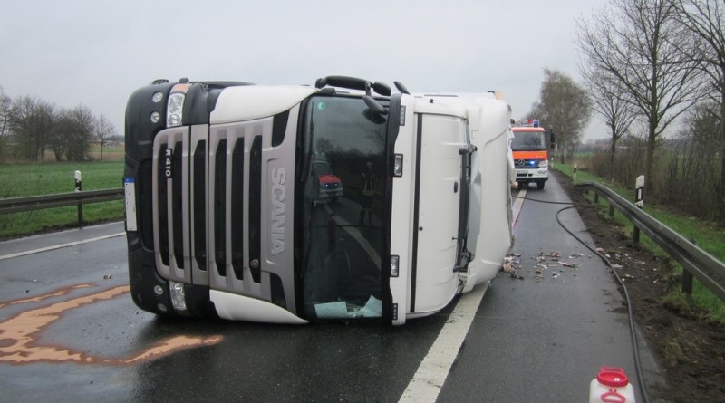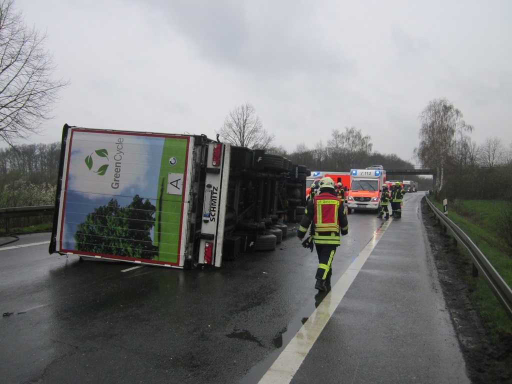 Zu einem Verkehrsunfall auf der B 525 mit einer vermeintlich eingeklemmten Person ist die Feuerwehr Gescher gerufen worden. Dort ist ein LKW auf die Bankette gekommen und ist anschließend auf der Seite liegend auf der Fahrbahn zum liegen gekommen Die Person war bei Eintreffen der Feuerwehr nicht mehr eingeklemmt und wurde schon im Rettungswagen versorgt. Die Feuerwehr musste daher nur ausgelaufene Betriebsstoffe aufnehmen und erste Absperrmassnahmen vornehmen, bis die Polizei die B525 komplett abgesperrt hatte. Die B525 bleibt bis zur Bergung des LKW durch eine Fachfirma weiter gesperrt