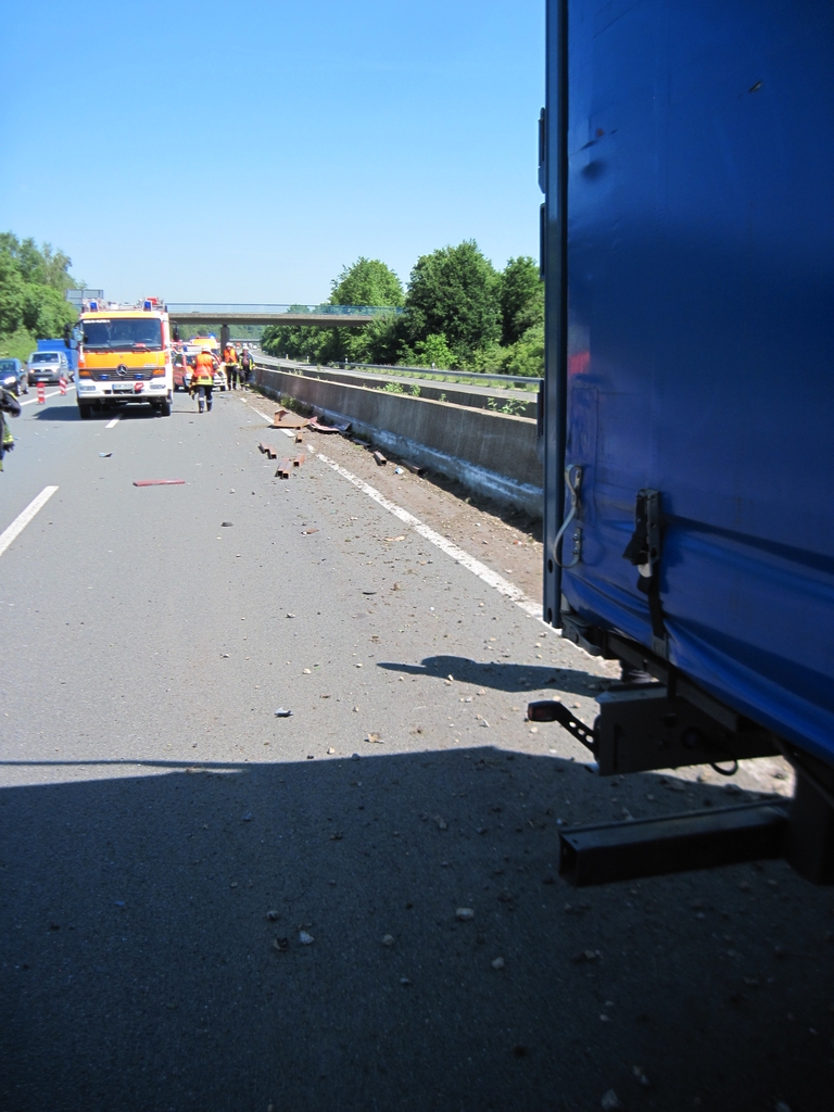Zu einem Verkehrsunfall auf der A31 ist die Feuerwehr Gescher gegen 12:35 Uhr gerufen worden. Aufgrund der Meldung, dass eine Person in einem PKW durch den LKW eingeklemmt sein sollte, wurde die Feuerwehr Gescher alarmiert. Vor Ort wurde sehr schnell festgestellt, dass der LKW aufgrund einer Reifenschadens die Kontrolle verloren hat und seitlich in die mittlere Betonschutzwand gekracht ist. Ein PKW war in dem Unfall nicht involviert und auch keine Person eingeklemmt wurde. Der LKW Fahrer kam mit dem Rettungswagen ins Krankenhaus. Die Feuerwehr sicherte unterdessen bis zum Eintreffen der Polizei die Einsatzstelle ab und reinigte die Fahrstreifen grob von Schotter und LKW-Teilen. Ein Fahrzeug der Feuerwehr konnte direkt wieder einrücken. Nachdem die Polizei die Einsatzstelle abgesichert hatte, konnte die Feuerwehr wieder einrücken.