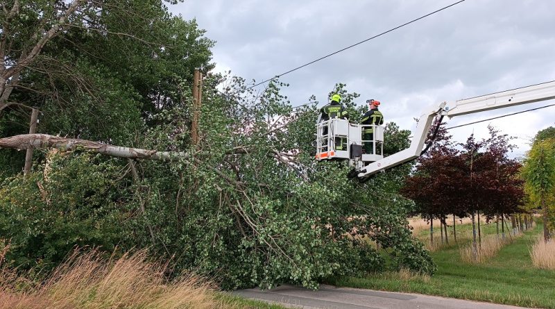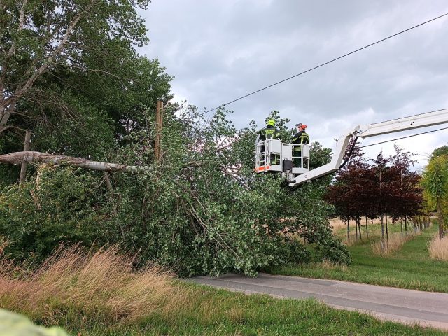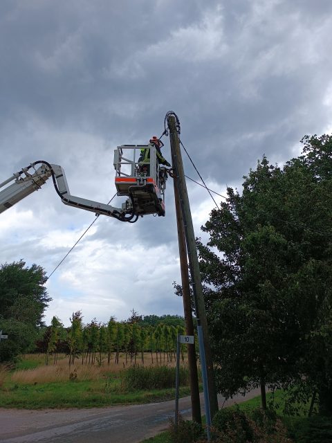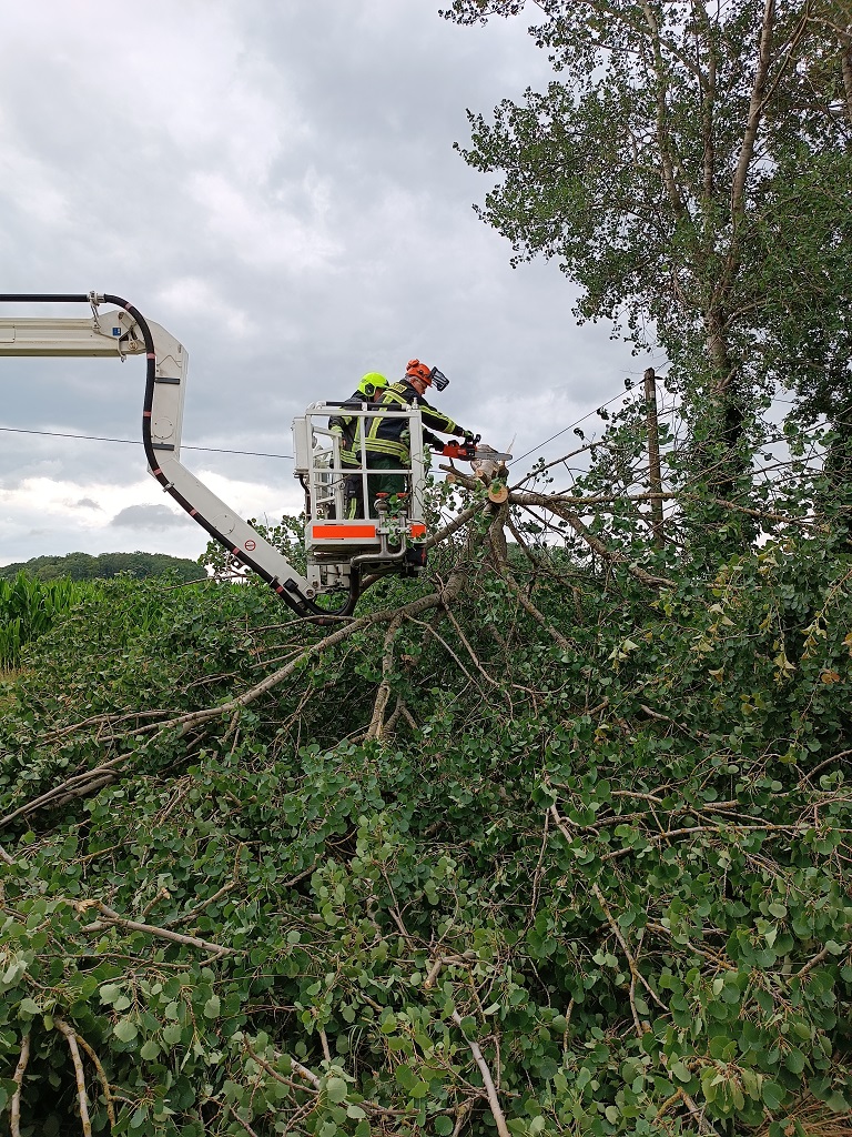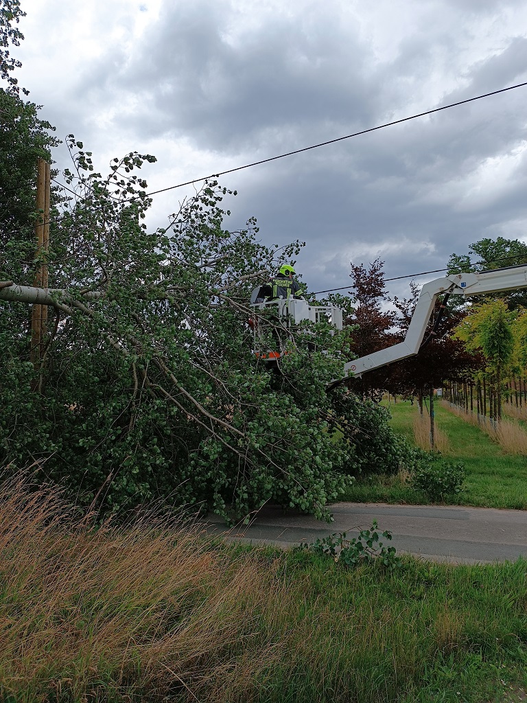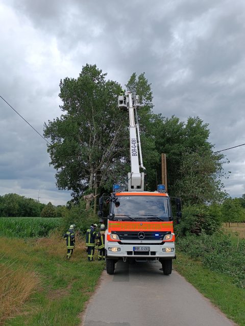 Direkt von der Einsatzstelle auf der Schildarpstraße (siehe vorheriger Bericht), bei dem der Teleskopmast nicht mehr benötigt wurde, rückte der Teleskopmast zu einer Einsatzstelle der Feuerwehr Velen, Löschzug Ramsdorf, in der Bauerschaft Holthausen aus. Dort war aufgrund des Sturmtiefs ein Baum abgeknickt und lag über einer Straße. Zudem lag der Baum auf der einen Straßenseite auf ein Telefonkabel und auf der anderen Straßenseite auf eine Stromleitung. Bei Eintreffen der Feuerwehr Gescher war neben dem Löschzug Ramsdorf bereits ein Mitarbeiter der Westnetz vor Ort und schaltete gerade die Stromleitung stromlos, so dass man mit der Beseitigung beginnen konnte. Zunächst wurde mit Hilfe des Teleskopmastes die Seilwinde des HLFs an ein Strommast angeschlagen, um diesen zu Entlasten. Dann konnte der Baum selber Stück für Stück vom Korb des Teleskopmastes mit einer Kettensäge geschnitten werden, so dass am Ende sowohl das Strom- wie auch das Telefonkabel unbeschädigt blieben. Abschließend wurde noch ein großer beschädigter Ast eines benachbarten Baumes entfernt.