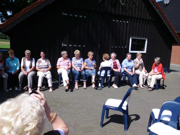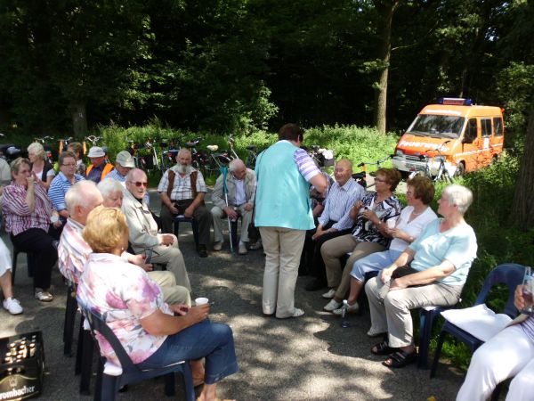 Die Voraussetzungen waren optimal, als sich der Tross auf den Weg machte. Der Festausschuss mit Reinhold Benson, Helmut Averesch und Hartmut Lieneweg hatte eine rund 35 Kilometer lange Tour ausgeguckt. Nach einer kleinen „Starthilfe“ ging es dem ersten Ziel entgegen. Auf dem Hof Averesch in Tungerloh-Pröbsting wurden die Wehrmänner mit ihren Partnerinnen bereits erwartet. Hier traf man auch auf die Kameraden aus Hochmoor. Weiter ging es über Wald- und Wirtschaftswege nach Holtwick. Eingebracht haben sich einige aktive Kameraden, die diejenigen im MTW fuhren, die nicht in der Lage waren die Tour mit dem Rad zu fahren. Im Gasthaus Vörding erfuhren die Wehrmänner einiges über die Geschichte der dortigen Feuerwehr, hatte doch der Wirt als ehemaliger Wehrführer die Geschichte des Löschzuges gerade erst aufgearbeitet. Gestärkt mit Kaffee und Kuchen ging es durch das „Musholter Feld“, nicht ohne einen Satteltrunk auf dem Hof Anton Kloster, zurück in die Glockenstadt. Ziel war jetzt das Gerätehaus. Die Tour in der frischen Luft hatte schon hungrig gemacht. Kurzerhand wurde die Halle in ein „Restaurant“ verwandelt, als der Partyservice ein leckeres Essen lieferte. Noch manche Stunde saß man zusammen um zu klönen.