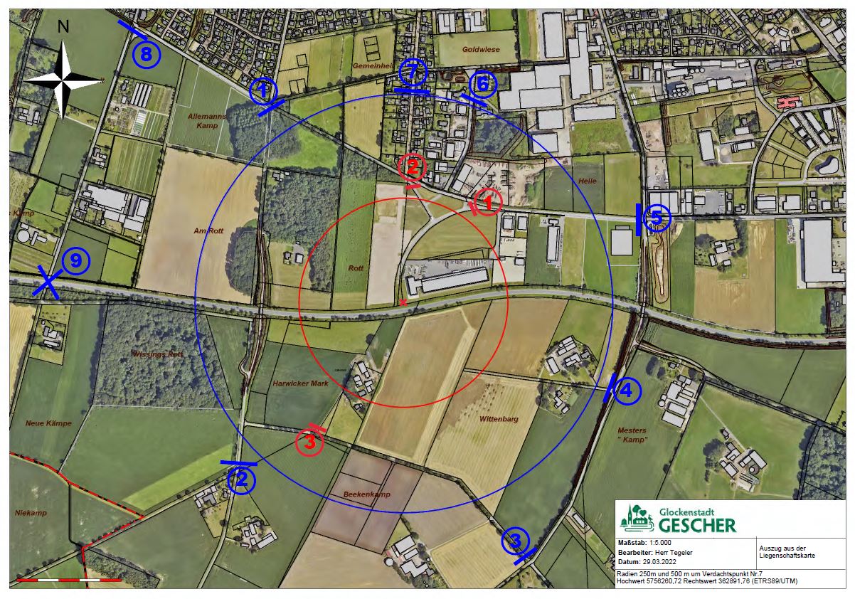 Wie gestern schon als Warnhinweis veröffentlicht, kam es zu einer Bombenentschärfung nach einem Fund durch den Kampfmittelräumdienst an einer Verdachtsstelle auf der Schildarpstraße. In Amtshilfe für das Ordnungsamt richtete die Feuerwehr Gescher dazu einen Führungsstab im Feuerwehrgerätehaus ein. Von hier wurden die Evakuierungsmassnahmen von 2 Unternehmen und einer Hofstelle innerhalb einer 200 m Sicherheitszone um den Fundort herum koordiniert. Eine weitere Hofstelle in unmittelbarer Grenze zur 200 m Sicherheitszone wurde zusätzlich informiert. Desweiteren übernahm die Feuerwehr in Absprache mit dem Ordnungsamt und der Polizei die Sperrung an der B525 sowie mehreren Zufahrtsstraßen ab 15:15 Uhr. Zusätzlich wurden entsprechende Informationen über die Presse sowie den Social-Mediakanälen der Feuerwehr und der Stadt Gescher verbreitet. Die Entschärfung konnte dann gegen 15:35 Uhr durch den Kampfmittelräumdienst begonnen werden. Nach erfolgreicher Entschärfung konnte gegen 16:05 Uhr die Absperrungen und Evakuierungen zurückgenommen und Entwarnung gegeben werden.