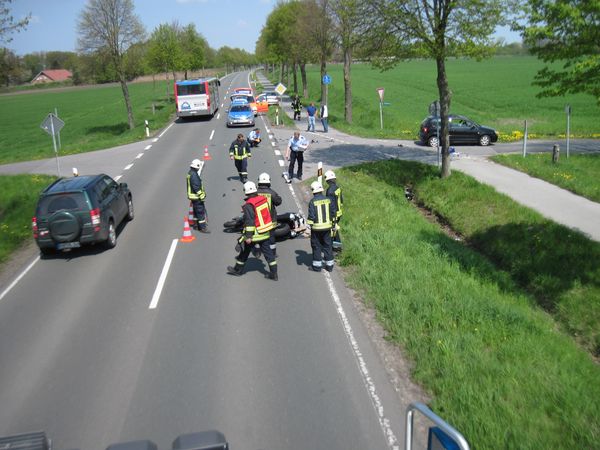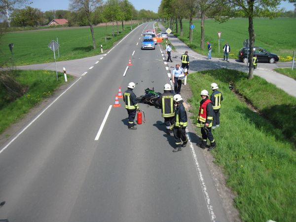Zu einem Verkehrsunfall zwischen einem PKW und einem Motorrad mussten die Kameraden der Freiwilligen Feuerwehr am heutigen Montag ausrücken. Auf der L608 in Richtung Hochmoor wollte ein Motorradfahrer ein vor ihm fahrenden PKW überholen. Als der PKW-Fahrer dann abbiegen wollte, übersah er den von hinten kommenden Motorradfahrer und es kam zum Zusammenstoß. Der Motorradfahrer wurde mit Notarzt und Rettungswagen (RTW) in ein Krankenhaus eingeliefert.