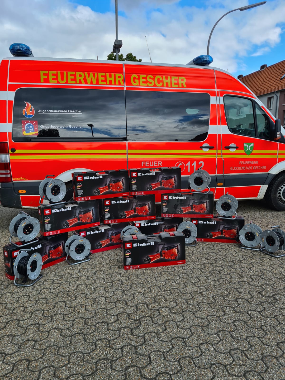 Von den erzielten Spendenerlösen der Jungendfeuerwehr – mittlerweile sind über 30.000€ eingegangen – wurden für den Stadtteil Erftstadt-Blessen und die Gemeinde Odendorf je fünf Kabeltrommeln und fünf Abbruchhämmer beschafft, welche von den Feuerwehrkameraden Steffen Kemna und Malte Hagemann übergeben wurden. Beide Kameraden sind regelmäßig vor Ort, um die anhaltenden Aufräumarbeiten zu unterstützen.