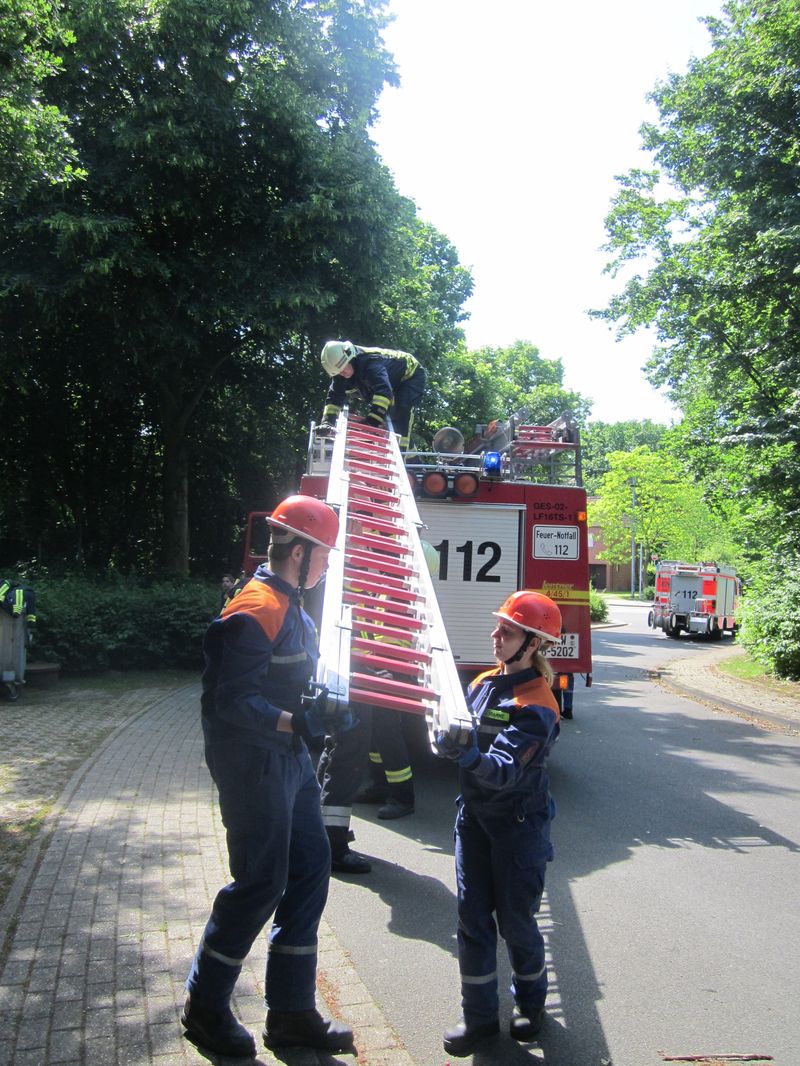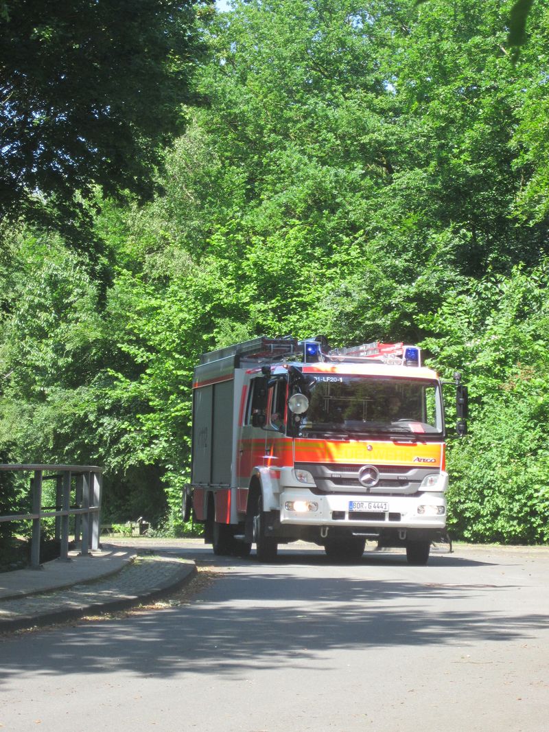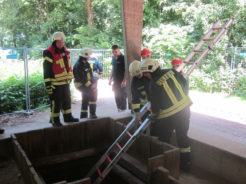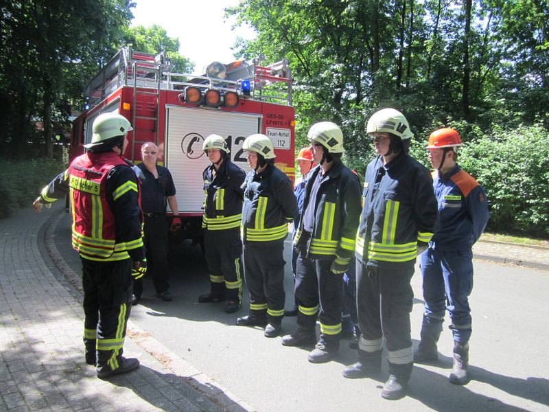 Zum Glück keine realen Einsätze, denn die Kameraden der Freiwilligen Feuerwehr besuchten das Übungsgelände am Institut der Feuerwehr (IdF) in Münster. Hier kann aus dem alltäglichen und nichtalltäglichen Einsatzgeschehen nahezu jede Einsatzsituation nachgestellt werden. So galt es Personen aus unterschiedlichen Lagen zu retten, verschiedene Brände zu bekämpfen und Umweltgefahren einzudämmen. Geübt wurde in gemischten Teams aus beiden Löschzügen und der Jugendfeuerwehr, so dass hier auch die Teamarbeit und das Verständnis zwischen den unterschiedlichen Abteilungen vertieft werden konnte.