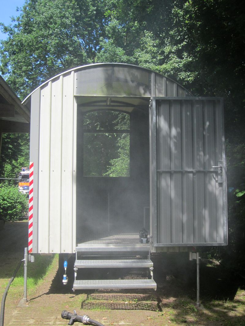 Anschließend blieb noch ein wenig Zeit, die Übungshalle zu erkunden. Die Übungshalle ist der modernste Teil des Übungsgeländes. Hier können alle Übungslagen über ein Touchpad elektronisch gesteuert eingespielt werden. Sei es ein brennendes Einfamilienhaus, austretende Stoffe im Labor oder auch „nur“ ein gefluteter Keller. Aber auch Vorgehen bei einem Sprinkleralarm und auch Rettungen aus großen Höhen lassen sich in der Halle üben.