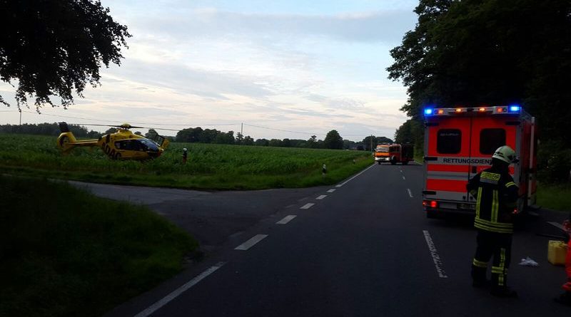 Zu einem Verkehrsunfall zwischen einem Motorrad und einem PKW ist eine Gruppe der Feuerwehr Gescher am Donnerstagabend gerufen worden. Auf der L571 in Richtung Holtwick kam es zum Zusammenprall bei dem der Motorradfahrer schwer verletzt wurde und mit dem Rettungshubschrauber (RTH) nach Münster gebracht werden musste. Für die Feuerwehr galt es die Landung des alarmierten RTH abzusichern und auslaufende Betriebsstoffe aufzunehmen. Anschließend wurde noch die Polizei bei der Unfallaufnahme unterstützt. Die L571 war in dem Bereich während des gesamten Einsatzes voll gesperrt.