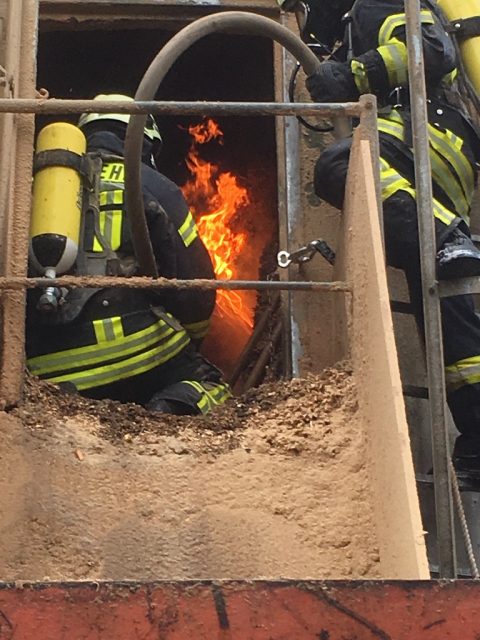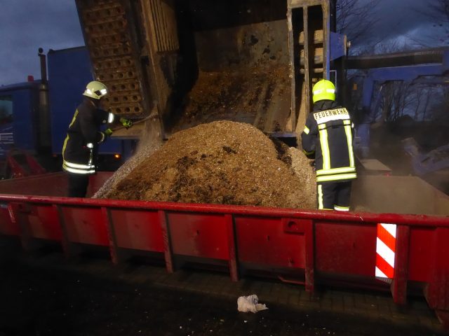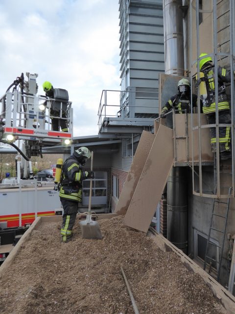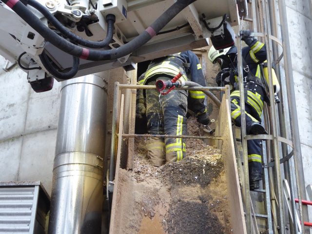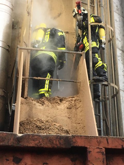 Die hohe Temperatur der Betondecke ließ jedoch einen Schwelbrand vermuten. Daher entschloss man sich recht schnell, dass der komplette Bunker geleert werden musste. Da die Gefahr einer Staubexplosion hoch war, musste der Bunker durch die Feuerwehr unter Atemschutz geleert werden. Dies erfolgte zunächst per Hand. Aufgrund der Explosionsgefahr und auch der Verschüttungsgefahr der eingesetzten Kameraden konnte zunächst nur aus der Türöffnung heraus gearbeitet werden. Im Laufe des Einsatzes wurde ein Unternehmen aus Ahaus mit einem Saugbagger hinzugezogen. So konnte ein Großteil der Späne abgesaugt werden.