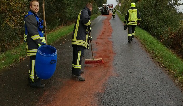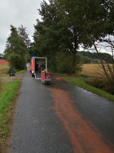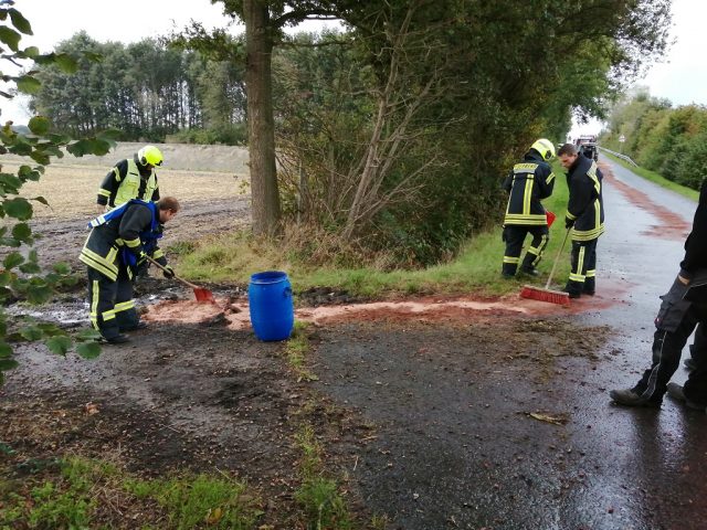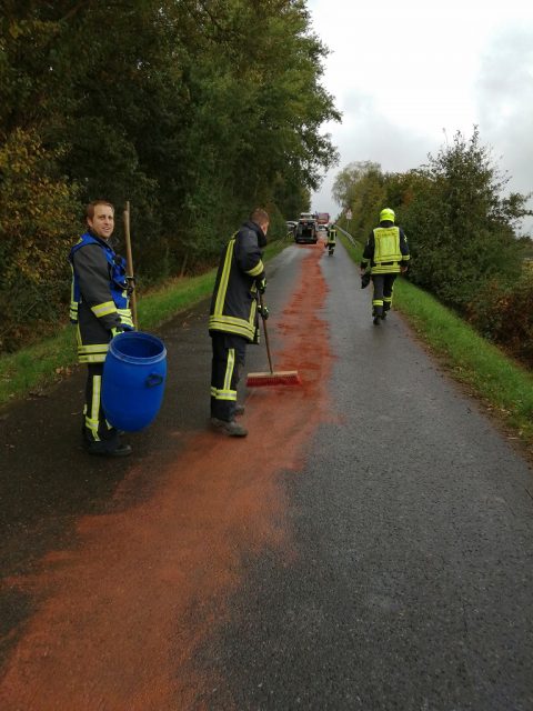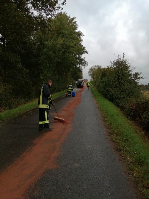 Gegen 12:30 Uhr wurde der Löschzug Hochmoor zu eienr Ölspur auf der Vennestegge alarmiert. Dort hatte ein Trakor Hydrauliköl durch eine gerissene Leitung verloren. Aufgrund eines Regenschauers verteilte sich das Öl über ca 50 m und lief auch die Autobahnbrücke hinunter. Die Feuerwehr streute die Ölspur ab und stellte Warnschilder auf.