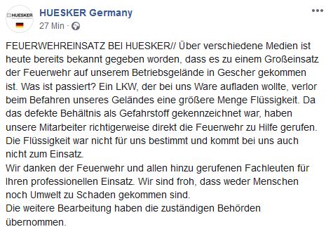 Diese Aussagen können wir voll bestätigen. Das Unternehmen Huesker war nur zufällig der Einsatzort und hatte mit dem austretenden Gefahrstoff nichts zu tun, sondern hat vorbildlich gehandelt und den Stoffaustritt sofort der Feuerwehr gemeldet (ein ausführlicher Bericht folgt in Kürze):