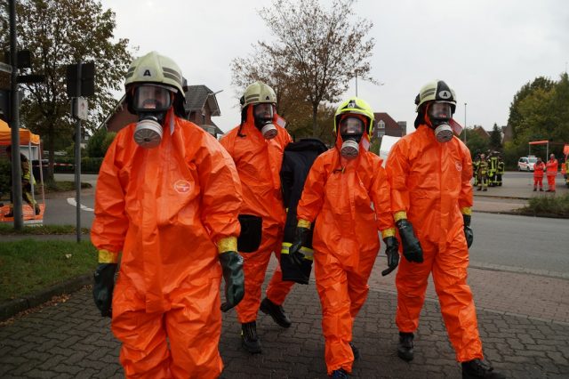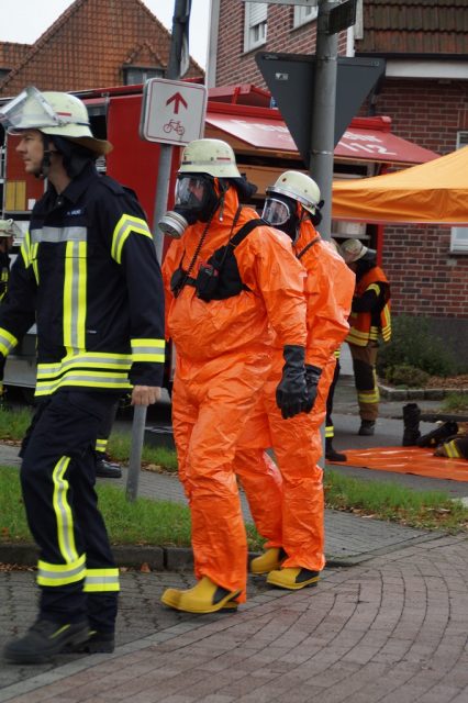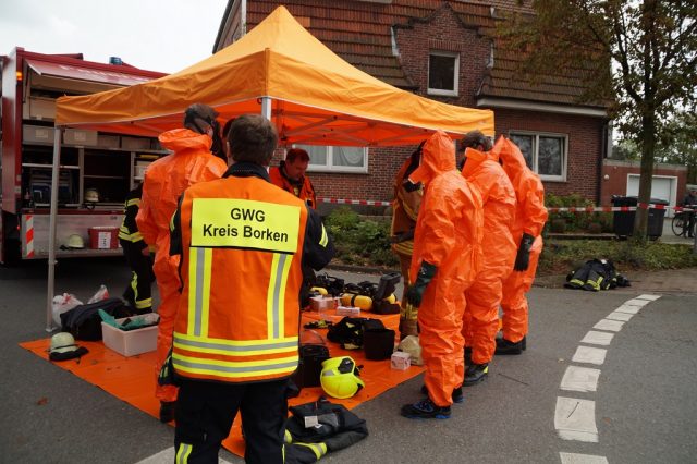 Zu einem langen und umfangreichen Gefahrguteinsatz wurde die Feuerwehr Gescher am Dienstag gegen 12:05 Uhr zu einem Betriebsgelände auf der Fabrikstraße gerufen worden.