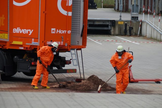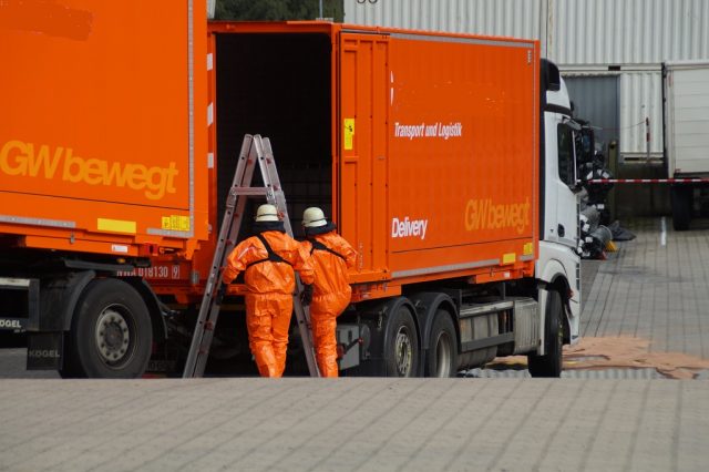 Dort wurde durch Mitarbeiter bei einem LKW, der bei dem Unternehmen weitere Ware laden sollte, festgestellt, dass aus einem im LKW bereits verladenden 1000 l Flüssigkeitsbehälter (IBC) Flüssigkeit auslief. Der Behälter war mit den Gefahrsymbolen „ätzend“ markiert. Folgerichtig wurde der LKW wieder verschlossen und in einem Bereich dirigiert, in dem der auslaufende Stoff nicht direkt in die Kanalisation gelangen konnte sowie die Feuerwehr alarmiert.