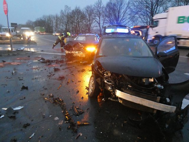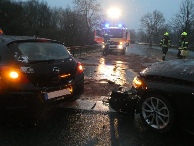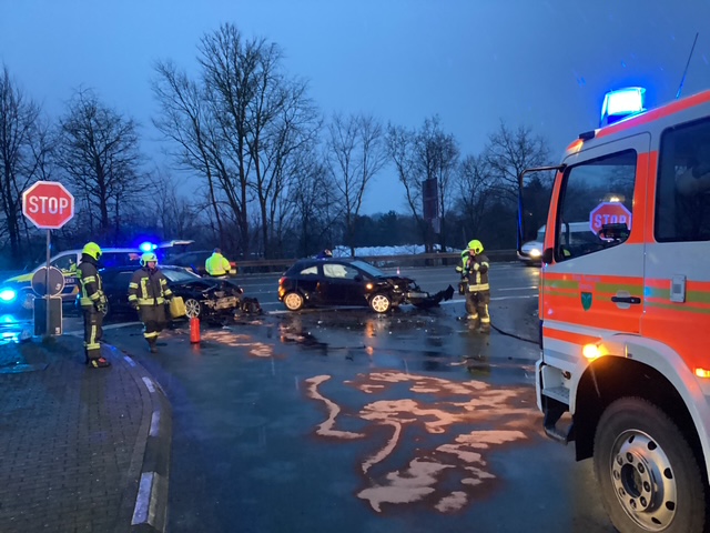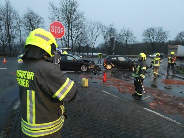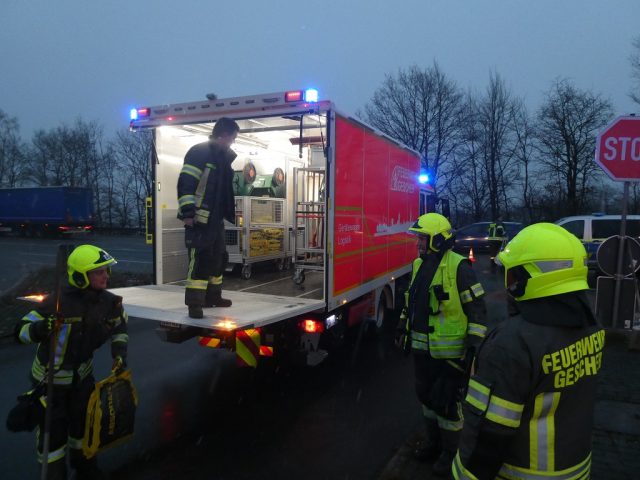 Gegen 8:10 Uhr wurde die Feuerwehr Gescher zu einem Verkehrsunfall auf der B525 gerufen. Dort stießen zwei Fahrzeuge im Abfahrtsbereich zur Bahnhofstraße zusammen. Beide Fahrer blieben unverletzt. Da ein Fahrzeug zunächst qualmte, wurde die Feuerwehr mit dem Stichwort Fahrzeugbrand alarmiert. Dies bestätigte sich bei Ankunft jedoch nicht. Dafür traten große Mengen von Betriebsstoffen aus. Die Feuerwehr streute zunächst die auslaufenden Stoffe ab und verhinderte eine Ausbreitung in die Kanalisation/Natur. In Absprache mit der Polizei und dem Ordnungsamt wurde eine Fachfirma zur abschließenden Reinigung der Straße beauftragt. Nach Fahrzeugbergung konnte die Feuerwehr den Einsatz beenden. Während des Einsatzes kam es zu starken Verkehrsbehinderungen.