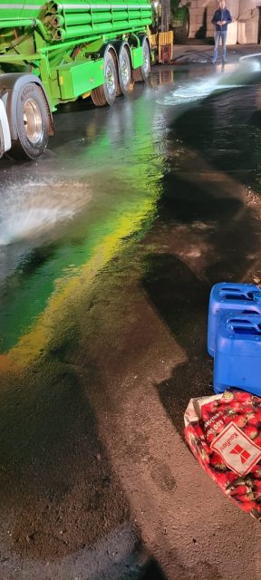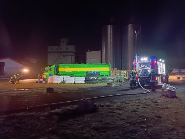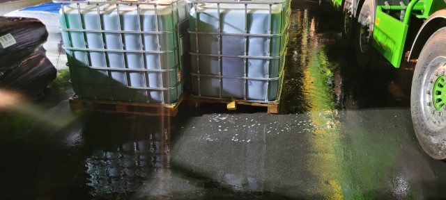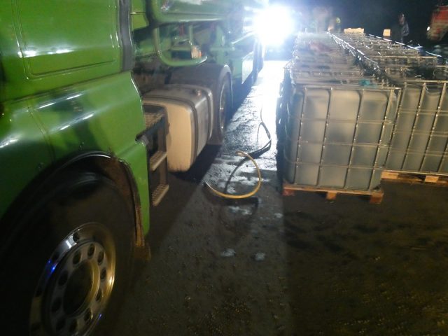Gegen 3:40 Uhr wurde die Feuerwehr Gescher zur Amtshilfe für die Polizei gerufen. Auf der Raiffeisenstraße wurden Dieseldiebe überrascht und die Polizei suchte weiträumig nach den flüchtigen Tätern. Bei der Suche fuhr sich ein Polizeifahrzeug in der Nähe des ehemaligen Hofes Wissing fest. Die Feuerwehr konnte das Fahrzeug wieder freiziehen. Anschließend sollten sie an den beiden LKWs, an denen Diesel abgezapft wurde, das ausgelaufene Diesel abbinden. Dazu wurde bei einem LKW Ölbindemittel aufgebracht. Beim zweiten LKW wurde jedoch festgestellt, dass es sich bei der Flüssigkeit nicht um Diesel handelte. Vielmehr gossen die Täter zunächst mehrere Kanister mit einem Düngemittelzusatz aus, um darin dann das Diesel zu füllen. Die Feuerwehr verständigte daraufhin das Abwasserwerk sowie die untere Wasserbehörde. Nach Rücksprache wurde der Zusatzstoff in die Kanalisation gespült und dort mit weiterem Wasser stark verdünnt. Das Mittel stellte nur aufgrund der hohen Konzentration eine Gefahr dar, stark verdünnt aber nicht.