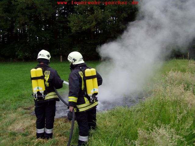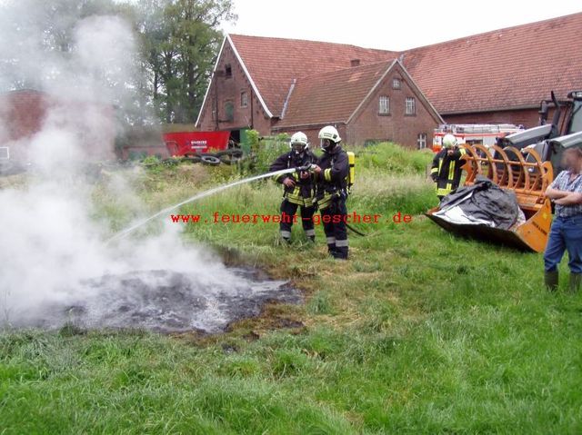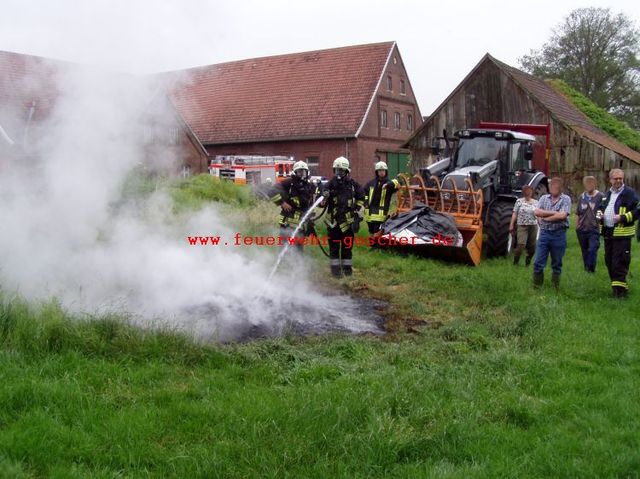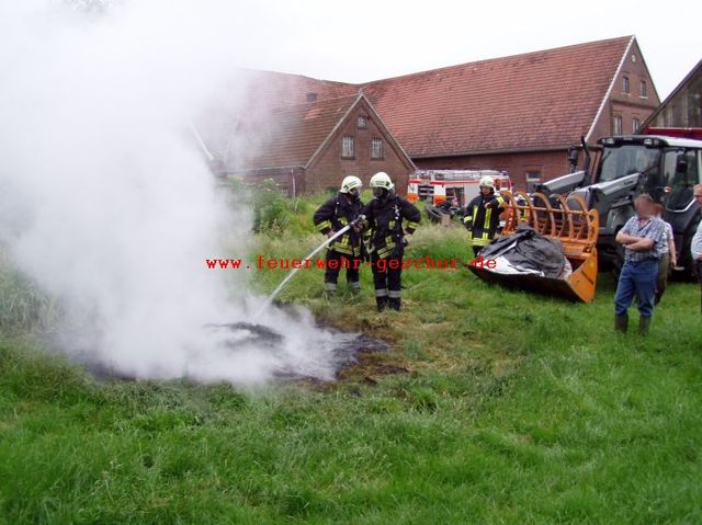 Ein Landwirt verbrannte Illegal auf seinem Grund Siloplane. Das Feuer wurde von einem Trupp unter schwerem Atemschutz mit dem Schnellangriff des LF 16 abgelöscht.