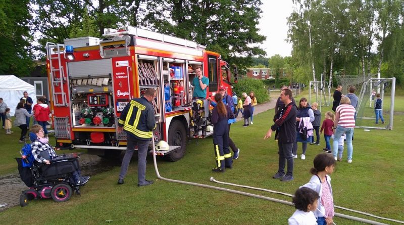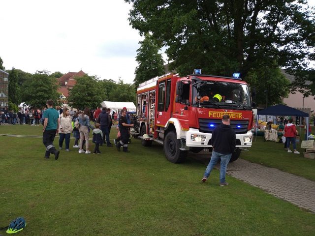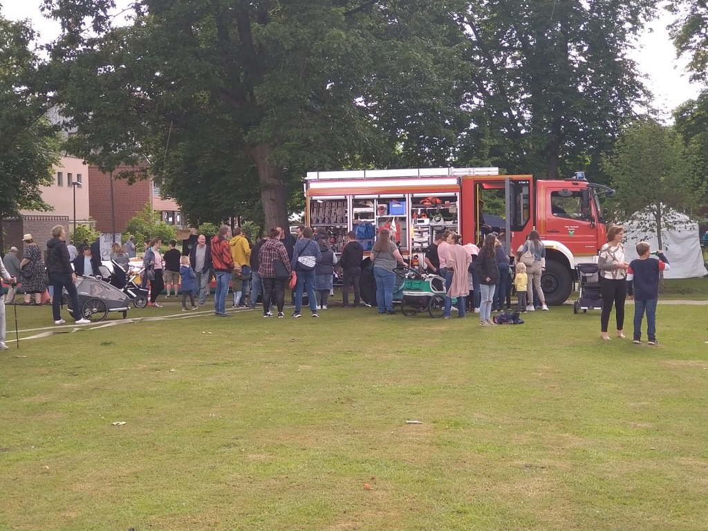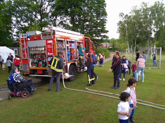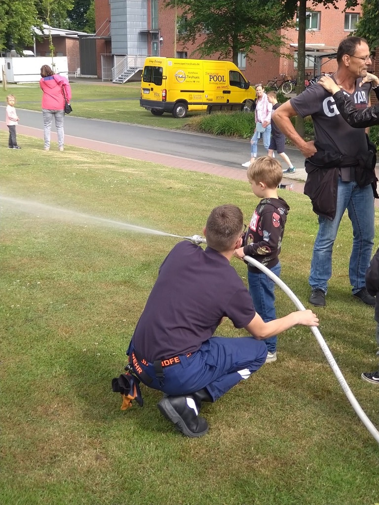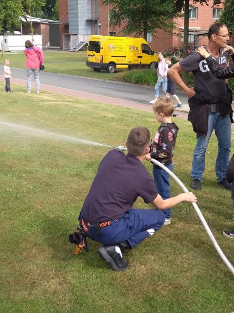 Auf dem Sommerfest von Haus Hall unterstützte die Feuerwehr Gescher am vergangenen Donnerstag. Es wurde ein Fahrzeug präsentiert sowie eine kleine Schlauchstrecke aufgebaut, so dass jeder der einmal wollte mit dem Wasserschlauch spritzen durfte. Es herrschte sofort großer Andrang am Fahrzeug.