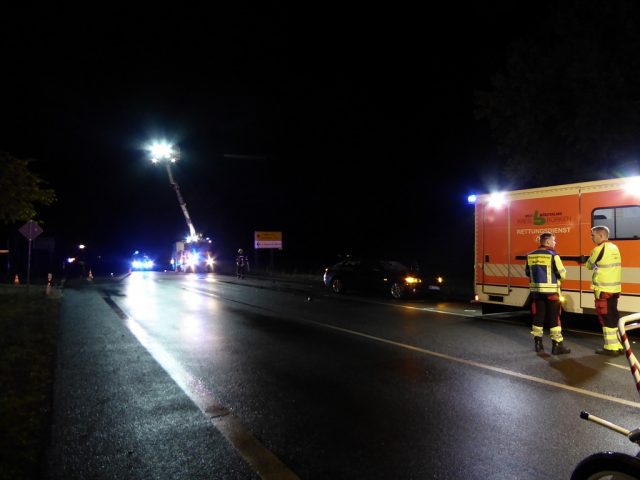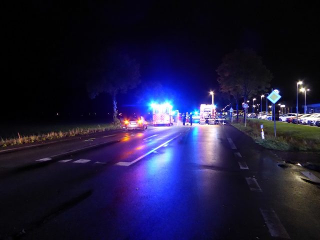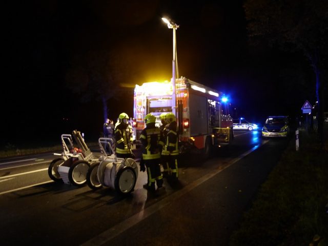 Gegen 23 Uhr wurde die Feuerwehr Gescher zu einem Verkehrsunfall auf der Stadtlohner Straße Kreuzung Grenzlandring gerufen. Dort ist ein 56-jähriger Gescheraner auf seinem Fahrrad mit einem PKW aus Stadtlohn zusammengestossen. Dabei zog er sich so schwere Verletzungen zu, dass er noch an der Einsatzstelle im Rettungswagen verstarb. Zunächst sollte die Landung eines Rettungshubschraubers durch die Feuerwehr ausgeleuchtet werden. Dieser konnte die Einsatzstelle aufgrund der Witterungsbedingungen nicht anfliegen. Im Anschluß leuchtete die Feuerwehr die Unfallstelle für die Polizei sowie einem Unfallsachverständigen für eine genaue Unfallaufnahme aus. Gegen 3:40 Uhr konnte die Feuerwehr Gescher wieder einrücken.