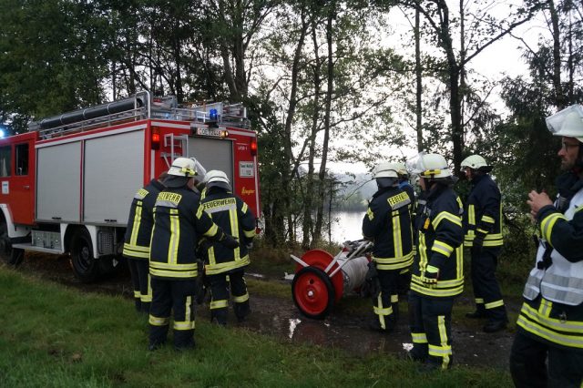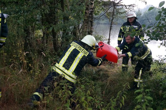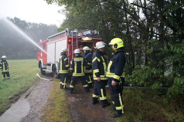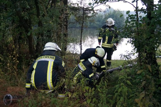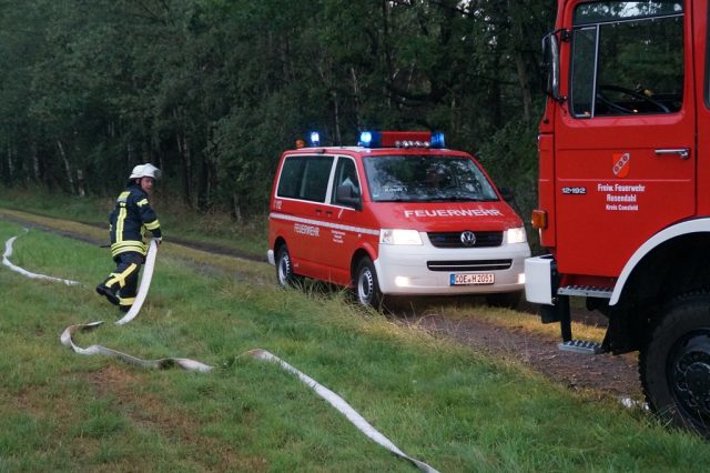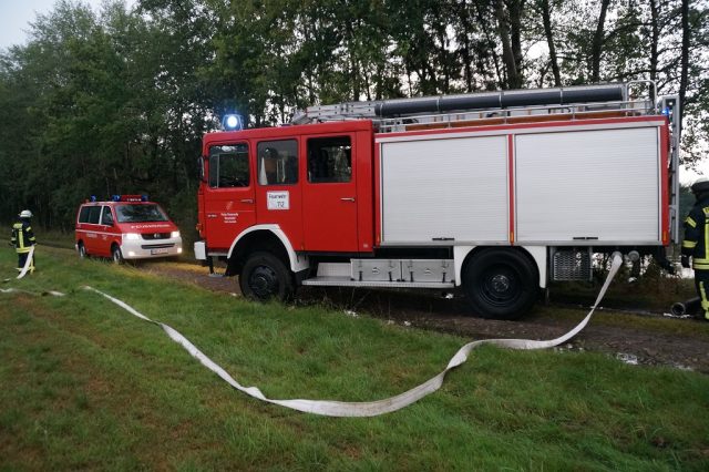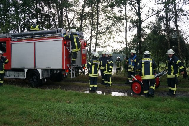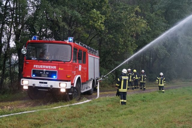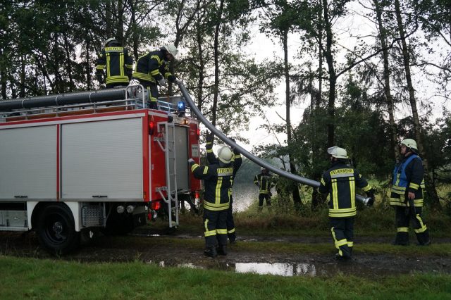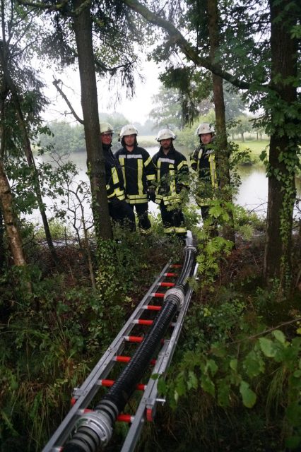 Parallel wurde zudem auch eine 1.500 m lange Schlauchstrecke zu einem in der Nähe liegenden Teich aufgebaut. Auch hier wurden sowohl Kameraden aus Gescher wie auch aus Holtwick eingesetzt. Das Schlauchmaterial auf den eingesetzten Fahrzeugen reichte jedoch nicht ganz aus. Am Ende fehlten etwa 60-80 m Schlauch. „Im Einsatzfall wäre dies aber mit Sicherheit schnell überbrückt worden, da hier bereits zu Beginn des Einsatzes mehr Fahrzeuge und damit mehr Material hinzugerufen worden wären“, so das Fazit der Übungsleitung Christian Nolte und dem Einsatzleiter Ralf Beuker. Die Übung wurde daraufhin abgebrochen. Zu diesem Zeitpunkt konnte aber bereits 8 C-Strahlrohre sowie der Monitor des Teleskopmastes kontinuierlich Wasser abgeben.