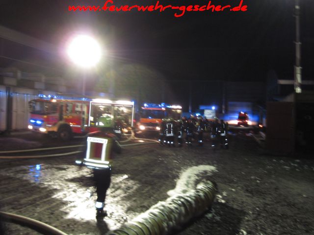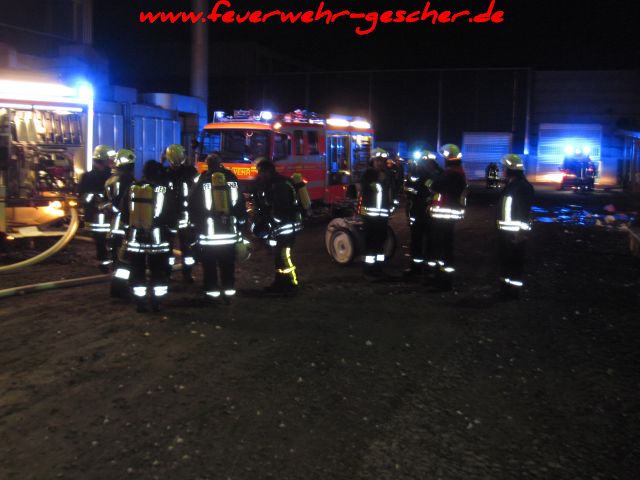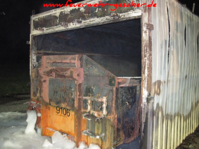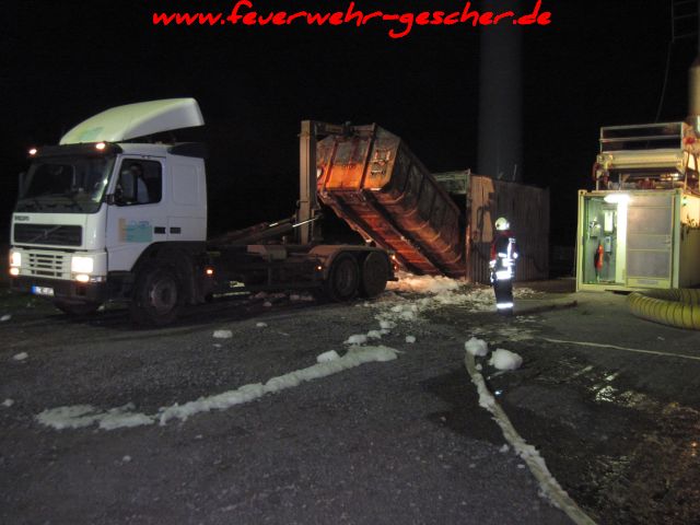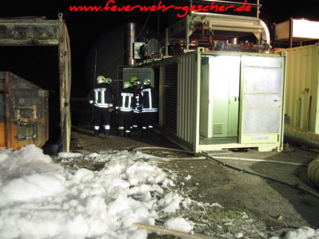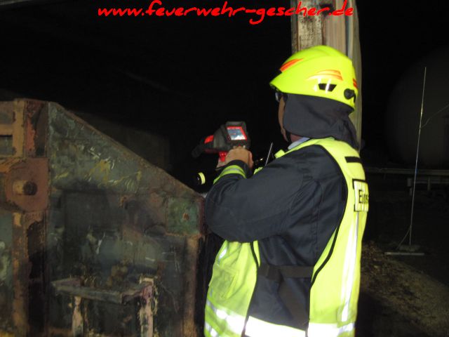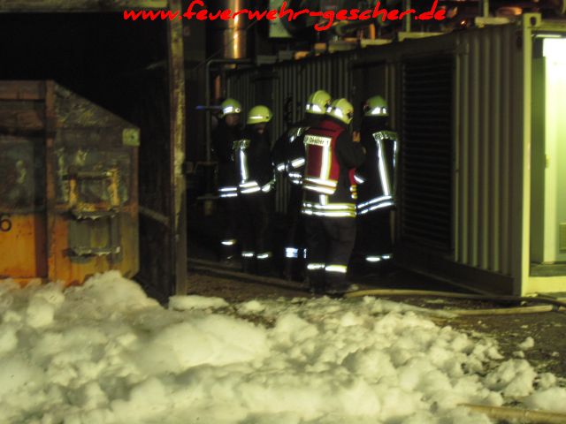 In unmittelbarer nähe zum Blockheizkraftwerk der EGW brannte, aus bislang unbekannten Gründen, ein mit Papierfasern bestückter Container. Die Fasern sollten in diesem Container vor der weiteren Verarbeitung trocknen. Durch den schnellen Einsatz konnte ein übergreifen der Flammen auf das Blockheizkraftwerk verhindert werden. Zur Brandbekämpfung rückte ein Trupp mit Pressluftatmer (PA) und Schaumrohr zum Brandherd vor. Ein weiter Trupp unter PA rückte zum Schutz der Umgebung mit einem C-Rohr vor.