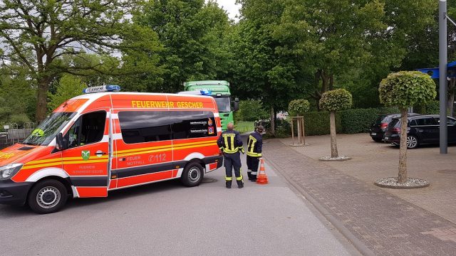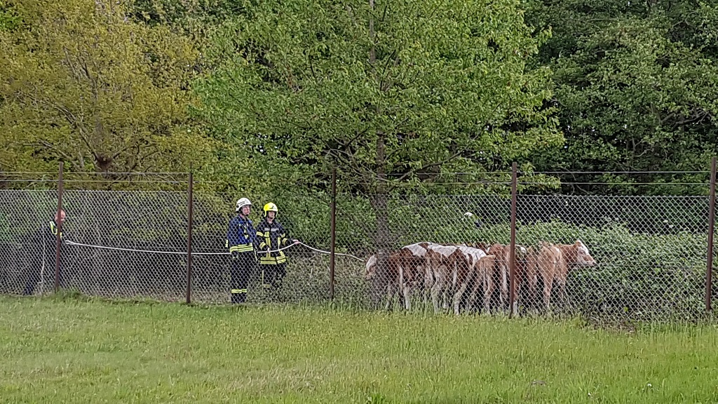 Gegen 11:40 Uhr wurde die Feuerwehr Gescher zum Schüringsweg alarmiert. Dort mussten 12 Rinder im Bereich der Berkel eingefangen werden, die von einem Feld ausgebrochen waren und sich dort auf der Straße sowie in dem Waldstück aufhielten.