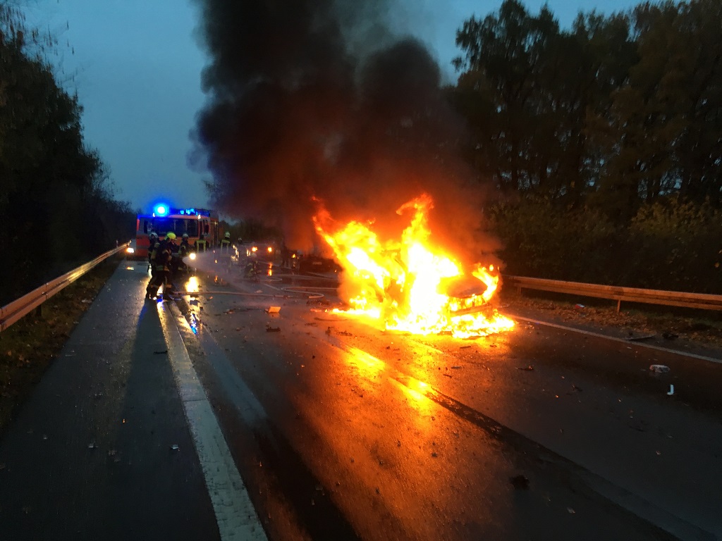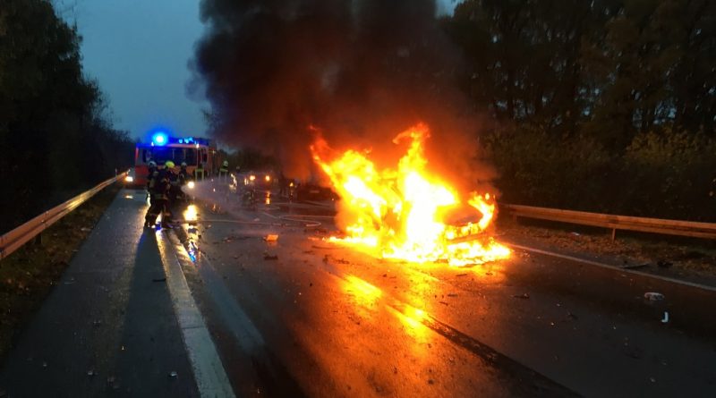 Gegen 7:38 Uhr wurde die Feuerwehr Gescher zu einem schweren Verkehrsunfall auf die B 525 gerufen worden. Zu dem Unfall kam es, als mehrere PKWS verkehrsbedingt warteten. Ein nachfolgender LKW fuhr auf diese PKWs auf und beschädigte dabei 4 PKWs stark. Ein PKW fing dabei Feuer und stand im Vollbrand. Im zuerst getroffenen PKW war die Person zunächst eingeklemmt, wurde aber durch einen zufällig vorbeifahrenden Feuerwehrkameraden aus Südlohn vor Eintreffen der Feuerwehr befreit. Die Feuerwehr Gescher versorgte zunächst bis zum Eintreffen des Rettungsdienstes die Verletzten und löschte den PKW. Bei dem Unfall wurden insgesamt 7 Personen verletzt, davon 3 schwer und 4 leicht. Sie wurden in Absprache mit dem Organisatorischen Leiter Rettungsdienst (Orgl) alle in die umliegenden Krankenhäuser transportiert. Der LKW-Fahrer blieb unverletzt. Bei dem Aufprall wurde auch der Dieseltank des LKWs beschädigt, so dass größere Mengen Diesel austraten. Diese wurden durch die Feuerwehr abgestreut und der Tank abgedichtet. Straßen.nrw beauftragte im Anschluss die Reinigung der Fahrbahn durch eine Fachfirma. Die hinzugerufene untere Wasserbehörde kontrollierte die Wasserabläufe der Fahrbahn. Hier konnte aber kein Dieseleintritt festgestellt werden. Die Fahrbahn blieb für die weitere Unfallaufnahme durch die Polizei noch gesperrt.