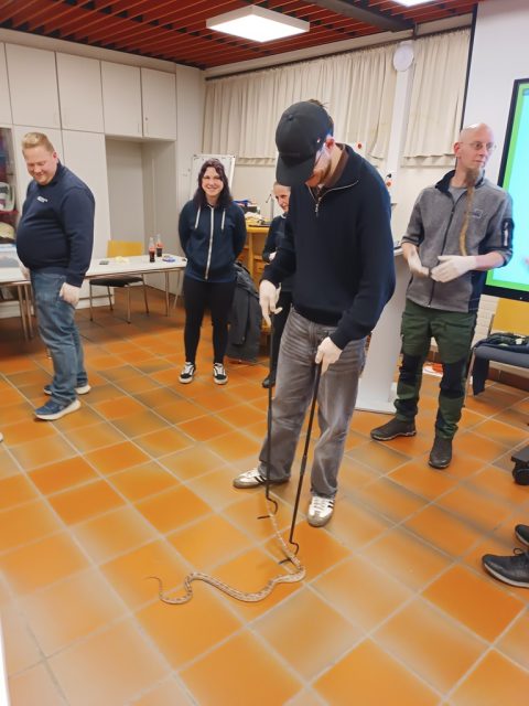 Aber es blieb nicht nur beim theoretischen Vortrag, denn sie hatten auch einige Schlangen mitgebracht. So konnten die Feuerwehr diese Hautnah erleben und auch den einfachen Umgang mit Schlangen mit Hilfsmitteln beüben. Für alle Kameraden eine hervorragende Gelegenheit sich mit dme Umgang besser vertraut zu machen.