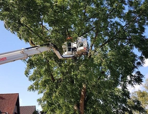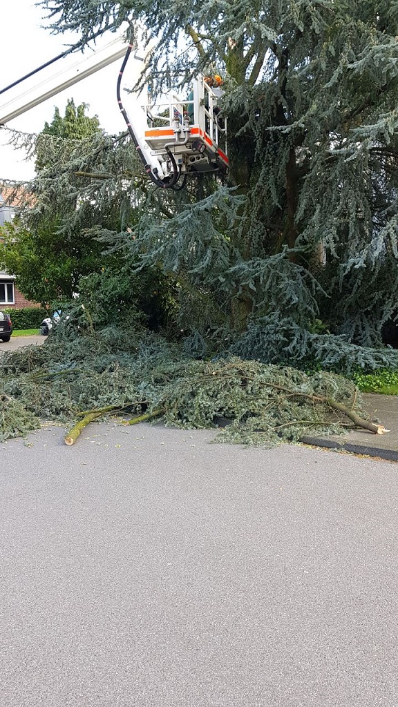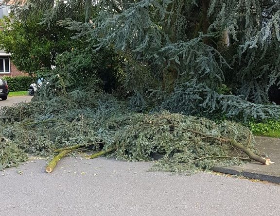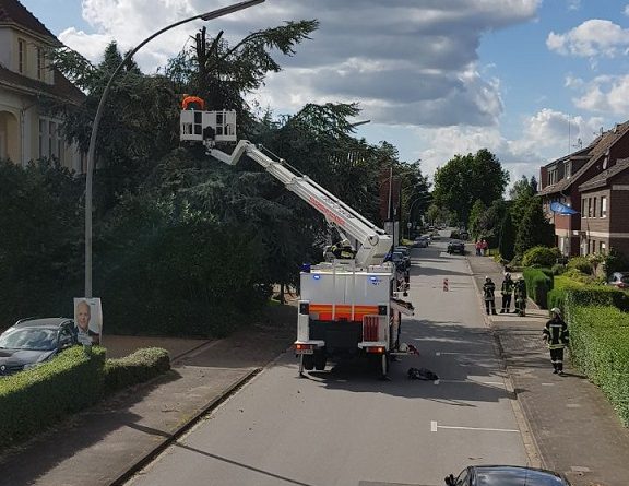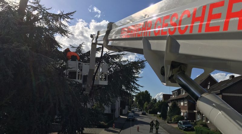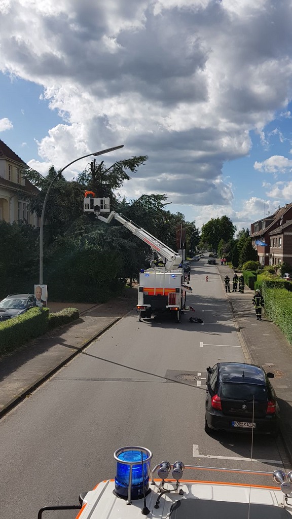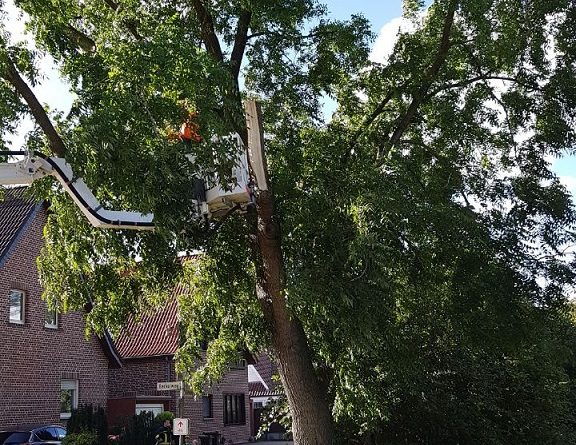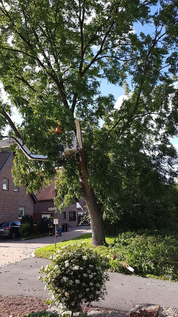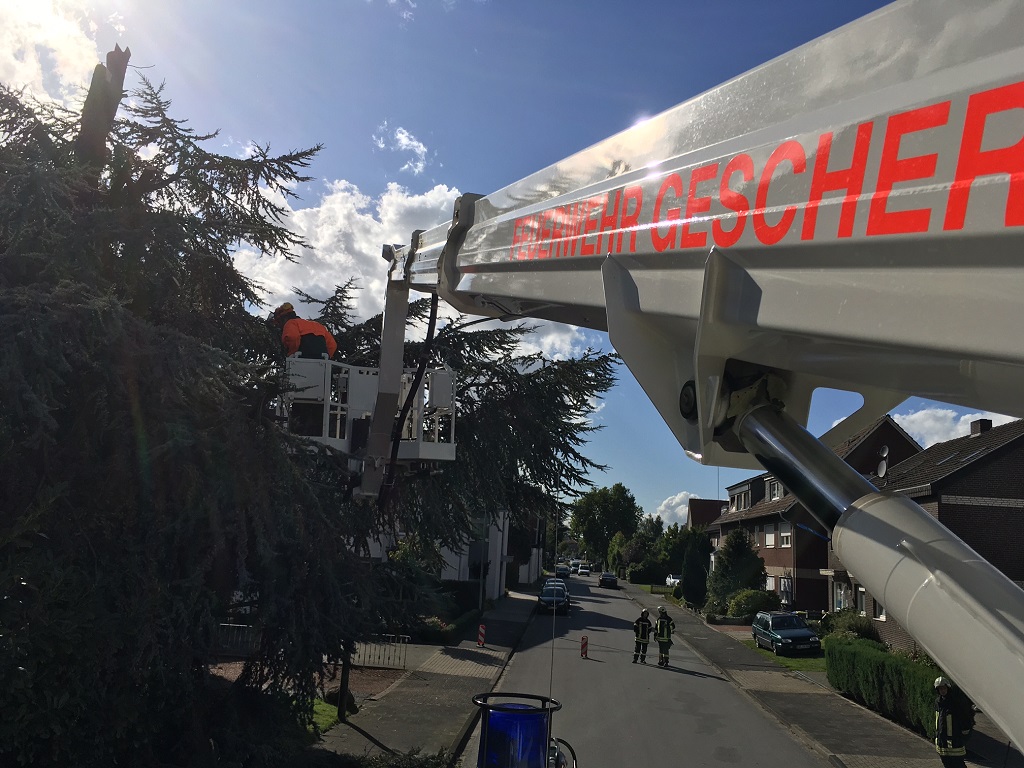Das Sturmtief Sebastian sorgte für mehrere Einsatzstellen innerhalb von Gescher. So musste die Feuerwehr zunächst gegen 14:40 Uhr zu einem Ast auf der Fahrbahn auf der Hofstraße ausrücken. Das Abreissen des Astes durch den Orkan sorgte dafür, dass der Baum so stark geschädigt war, dass zur Sicherheit weitere Bereiche des Baum gesägt werden musste um die Windlast vom Baum zu nehmen. Für die Einsatzdauer musste die Hofstraße für den Verkehr gesperrt werden. Während dieses Einsatzes wurden zwei weitere Einsatzstellen gemeldet. So musste die Feuerwehr an der Daimlerstraße zusammen mit dem Bauhof tätig werden. Der weitere Einsatz war dann am Berkelweg. Auch hier hat der Orkan einen großen Ast aus einem Baum gebrochen. Zur Sicherheit mussten weitere Teile des Baumes aus der Krone geschnitten werden. Anschließend wurde noch ein weiterer Einsatz gemeldet und zwar in Büren. Dort brachen zwei große Äste aus einem Baum und beschädigten dabei einen Strommast, so dass dieser auch umfiel. Hier wurde die Westnetz hinzugezogen, um die Leitung stromlos zu schalten. Anschließend konnten die Äste von der Straße entfernt werden. Der Baum war so weit geschädigt, dass dieser dann ebenfalls gefällt werden musste. Da die Stromleitung beschädigt war, blieben einige anliegende Höfe noch länger ohne Strom.