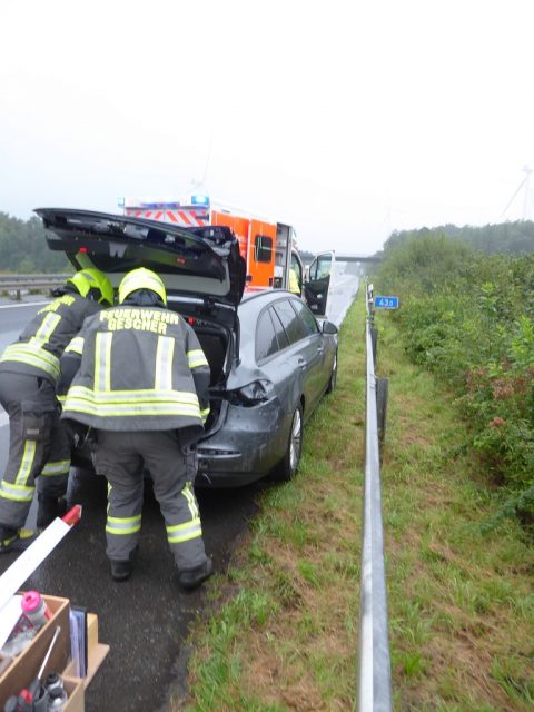 Gegen 9:00 Uhr wurde die Feuerwehr Gescher zu einem Unfall auf die A31 in Fahrtrichtung Oberhausen gerufen. Dort hatte ein PKW Fahrer ein Alleinunfall. Er war zunächst in die linken Leitpfosten geraten. Anschließend blieb das Fahrzeug nach ca 100 m auf dem Standstreifen stehen. Beim Unfall verletzte sich der Fahrer. Er wurde durch den Rettungsdienst versorgt. Die Feuerwehr sicherte das Fahrzeug und nach kurzfristiger Sperrung beider Fahrbahnen konnten die Trümmerteile von den Fahrbahnen geräumt werden. Anschließend wurde die Einsatzstelle an die Polizei übergeben.