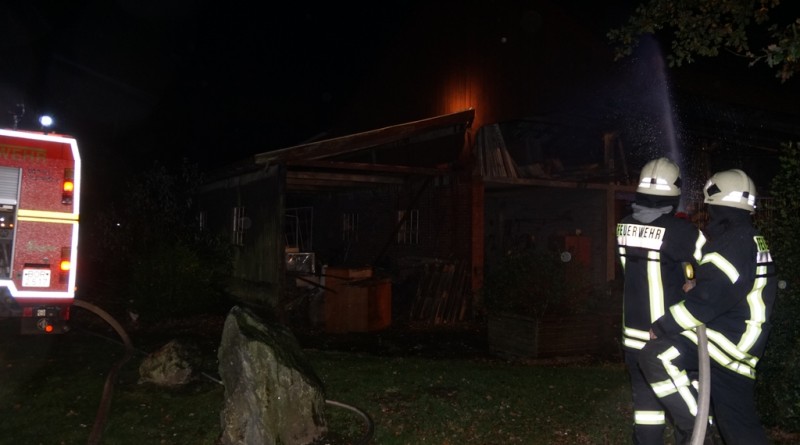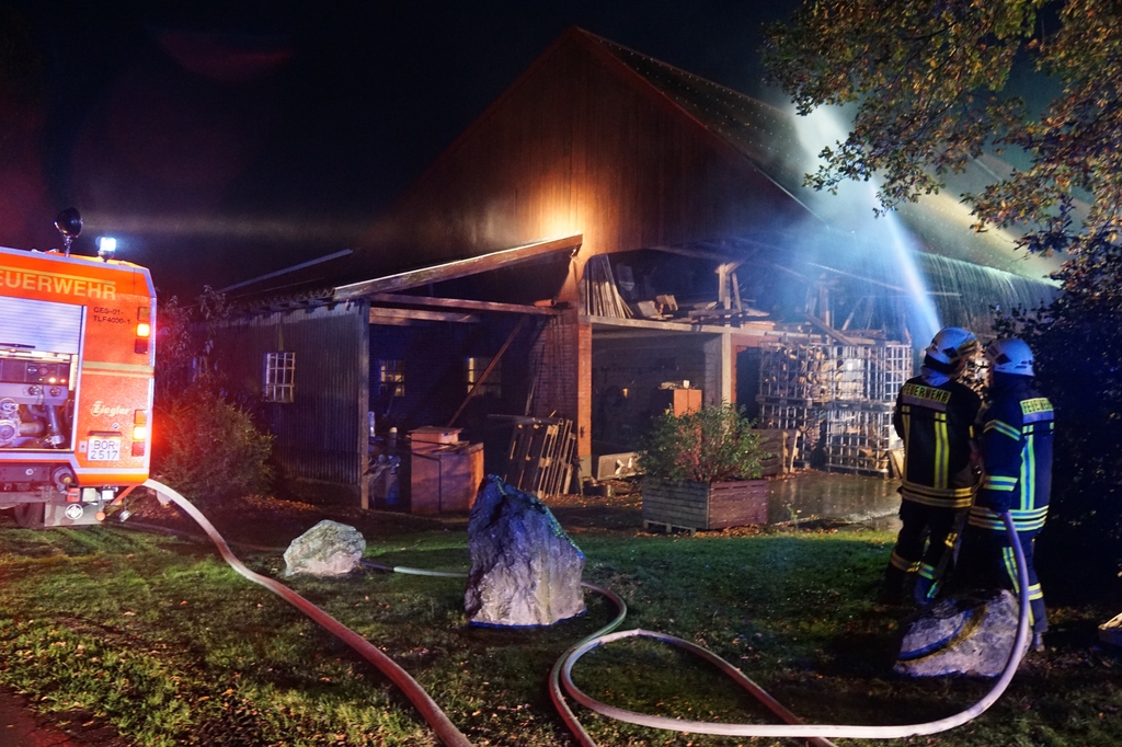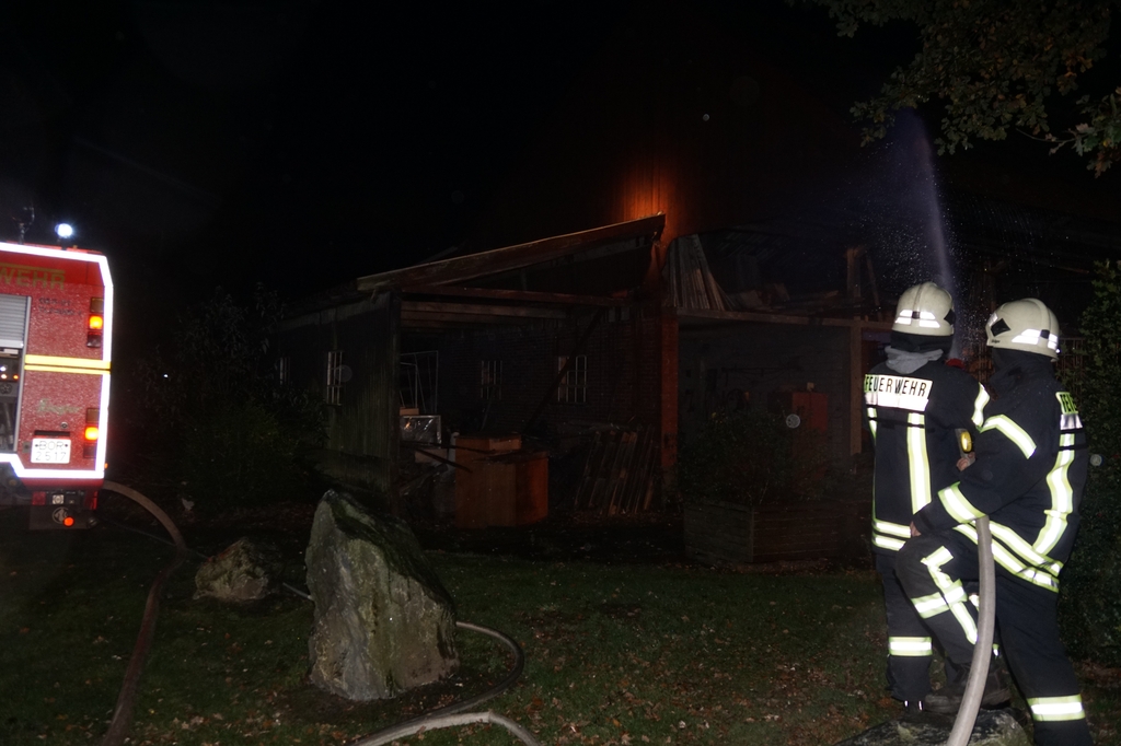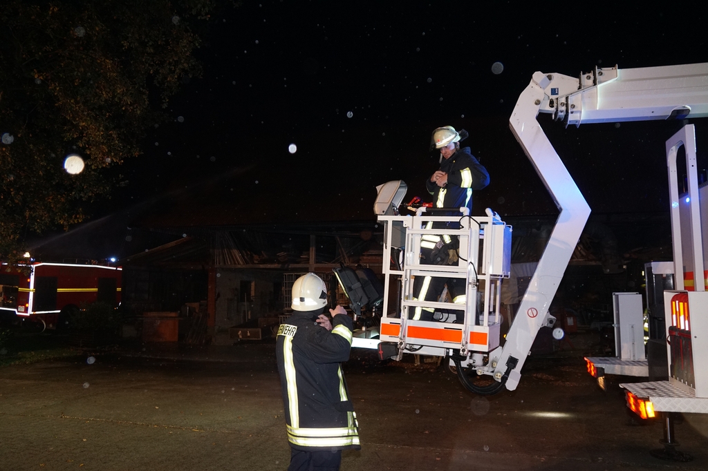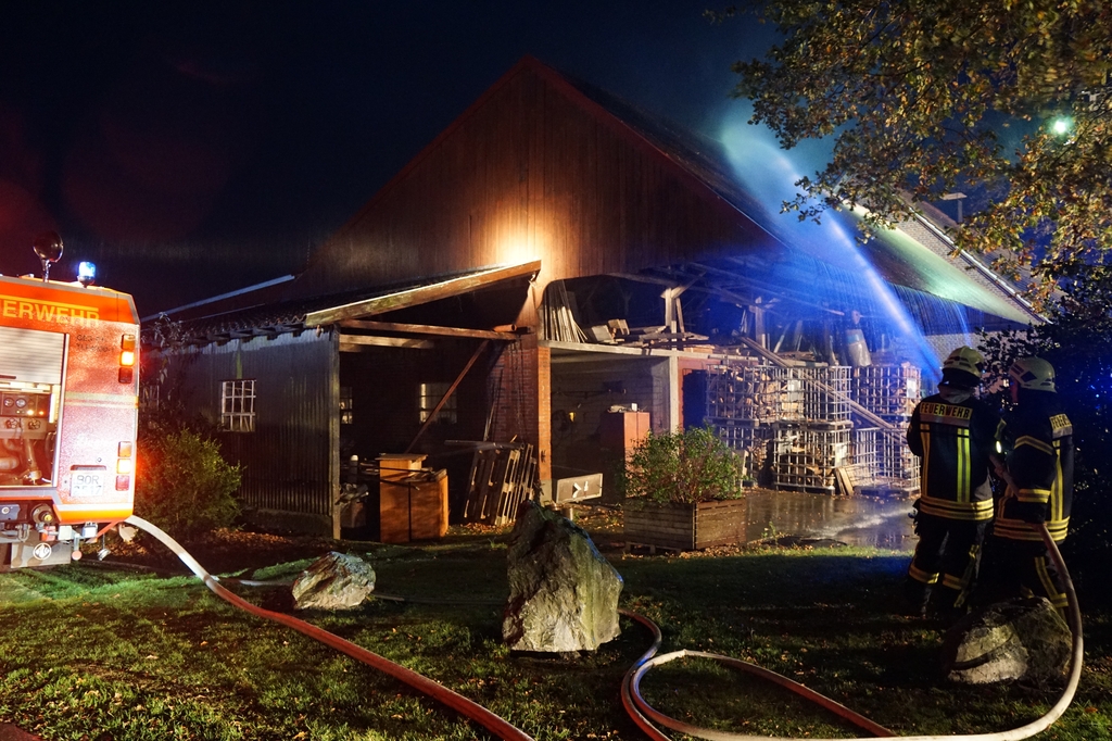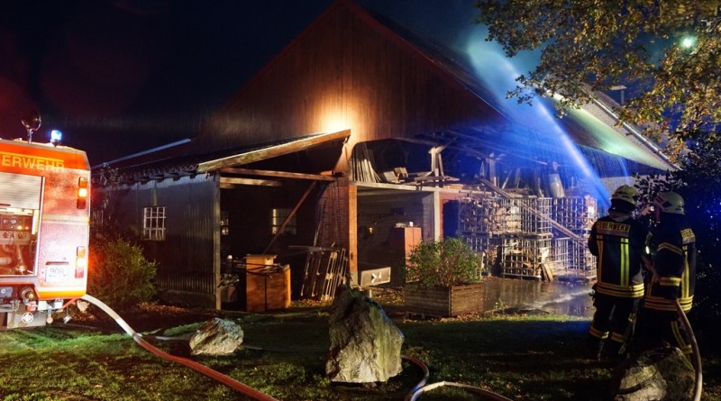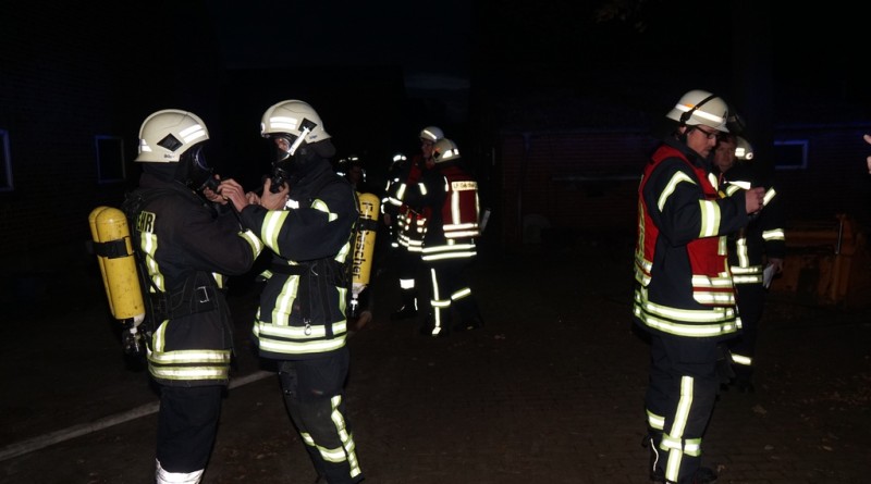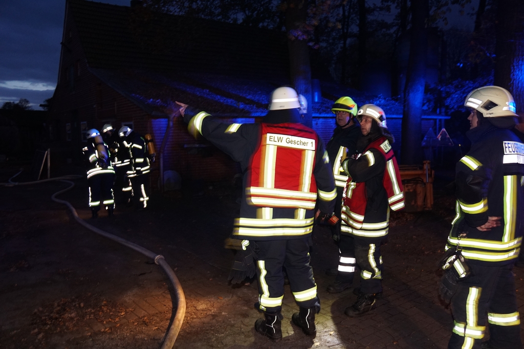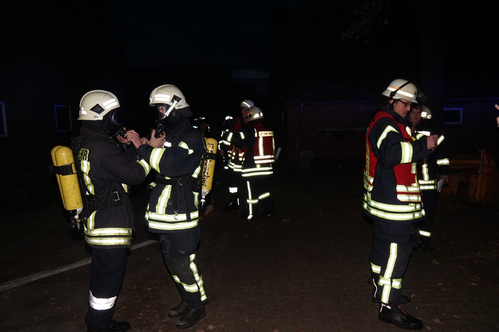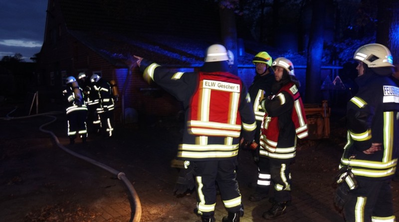 „Vollalarm, Feuer Bauernhof“ lautete am Freitag um kurz nach 17 Uhr das Einsatzstichwort für die gesamte Feuerwehr sowie den DRK Ortsverein Gescher. Zusätzlich zur Alarmierung über die digitalen Meldeempfänger wurde Sirenenalarm in Gescher und Hochmoor ausgelöst. Einsatzstelle laut Leitstelle war der Hof Paskert in Tungerloh-Pröbsting. Hier stellte sich schnell heraus, dass es sich um eine großangelegte Herbstübung handelte. Die Übung war nicht angekündigt um die Einsatzbereitschaft der Einsatzkräfte festzustellen. Die Ausgangslage stellte sich wie folgt dar: Der Dachstuhl einer Scheune sollte in Vollbrand stehen, wobei das Feuer in einer nahen Schirmschoppe mit Dieseltankanlage entstanden sein sollte. Zwei Kinder und ein Arbeiter galten als vermisst. Eine Zisterne direkt auf dem Hof und ein mehrere hundert Meter entfernter Teich dienten als Wasserentnahmestellen. Unter den wachsamen Augen von Kreisbrandmeister und Ordnungsamt wurde die Übung erfolgreich durchgeführt. Bis die lange Wegestrecke vom Teich aufgebaut war, wurde zuerst aus den Fahrzeugtanks und der Zisterne Wasser entnommen und zusätzlich mit dem Tanklöschfahrzeug (TLF, 5000L Wasser an Bord) ein Pendelverkehr eingerichtet. Es wurden zur Brandbekämpfung und Menschenrettung insgesamt 9 C-Rohre und 1o Atemschutzgeräteträger eingesetzt.