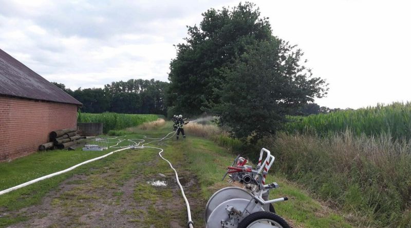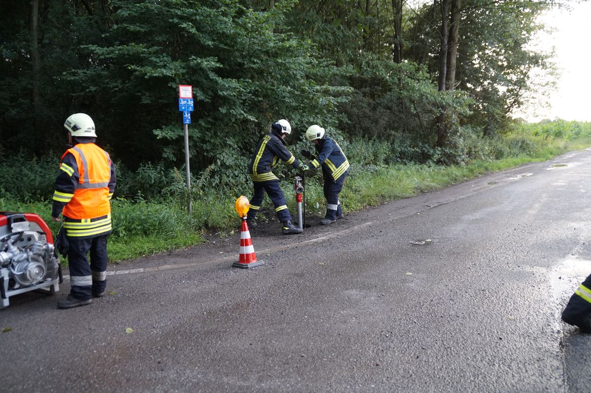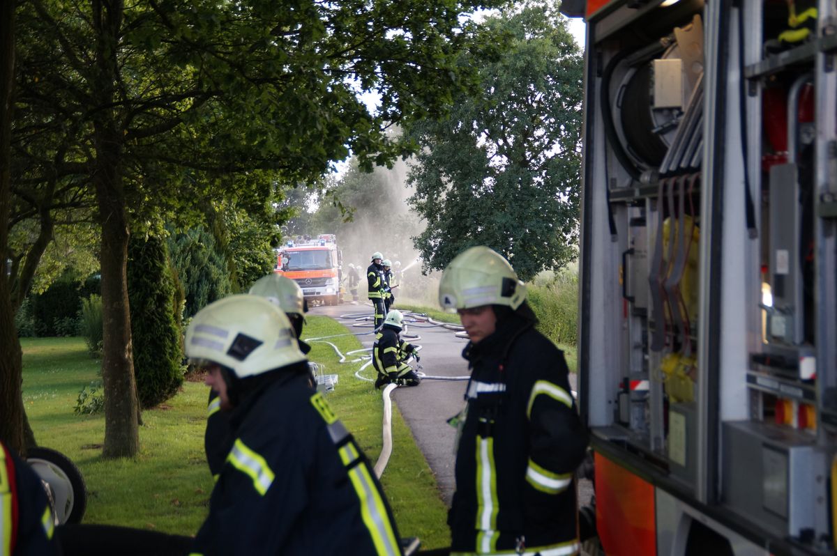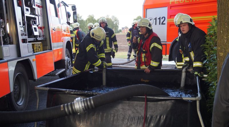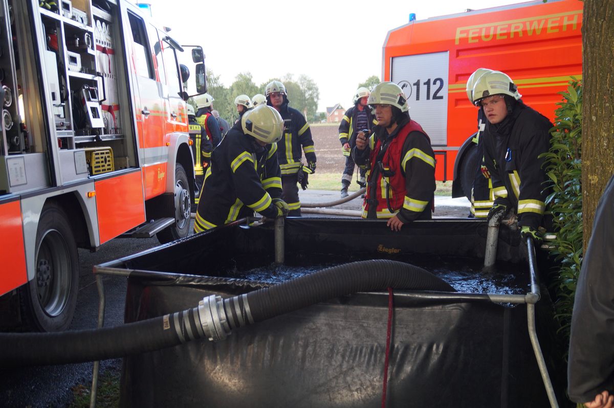 Die Übungsleiter Stefan Theseling und Ralf Blommel stellten in der Bauernschaft Tungerloh Pröbsting einen Scheunenbrand auf einem Landwirtschaftlichen Betrieb dar und hierfür musste die Mannschaft des Neuen die Wasserversorgung übernehmen. Während die anderen Fahrzeuge direkt die Einsatzstelle anfuhren um dort die vermeintlichen Patienten zu versorgen und erste Löschangriffe vornahmen, fuhr das LF 20 Kat zu einem Hydranten an der Straße Schultenrott. Von hier aus musste eine ca 900 Meter lange B-Schlauchleitung bis zur Einsatzstelle verlegt werden. Hierbei zeigte sich auch schon ein kleiner Vorteil des Neuen, auf dem Fahrzeug sind 320 Meter B-Schlauch so verlastet das sie während der Fahrt abgelassen werden kann. Die restlichen 280 Meter B-Schlauch vom Fahrzeug mussten aber wieder von Hand ausgerollt werden. Nach den 600 Metern wurde das Fahrzeug als Zwischenpumpe eingesetzt. Die restlichen ca 300 Meter Schlauchleitung wurden in der Zwischenzeit von der Einsatzstelle in Richtung Wasserentnahmestelle verlegt.